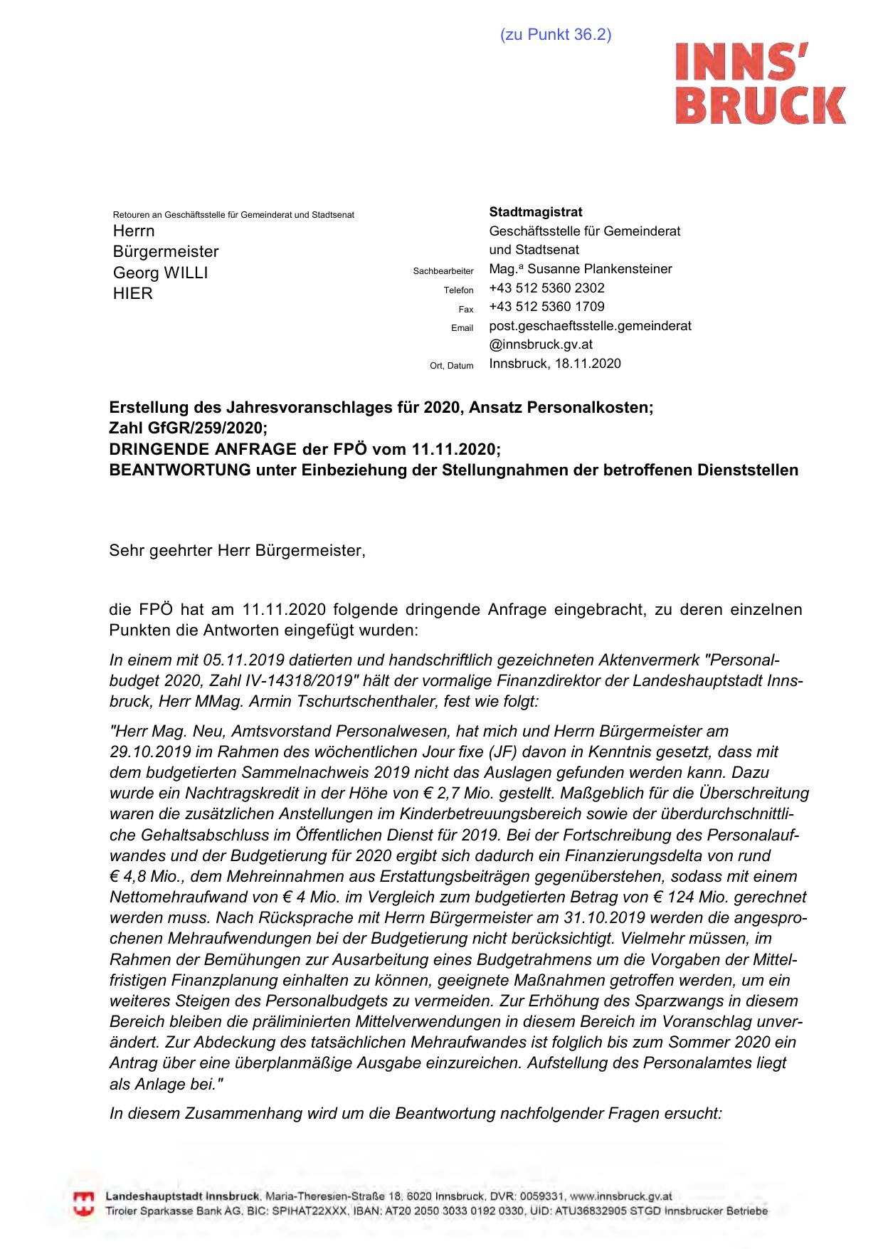 In einem mit 05.11.2019 datierten und handschriftlich gezeichneten Aktenvermerk "Personalbudget 2020, Zahl IV-14318/2019" hält der vormalige Finanzdirektor der Landeshauptstadt Innsbruck, Herr MMag. Armin Tschurtschenthaler, fest wie folgt: