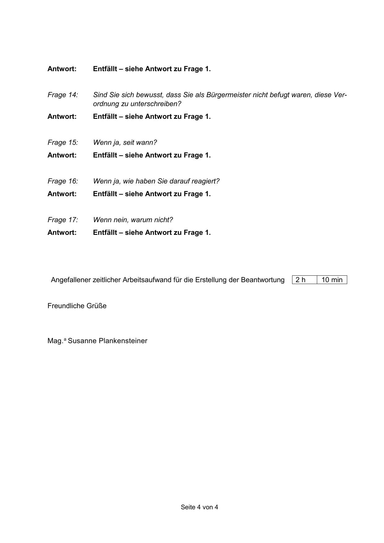Angefallener zeitlicher Arbeitsaufwand für die Erstellung der Beantwortung