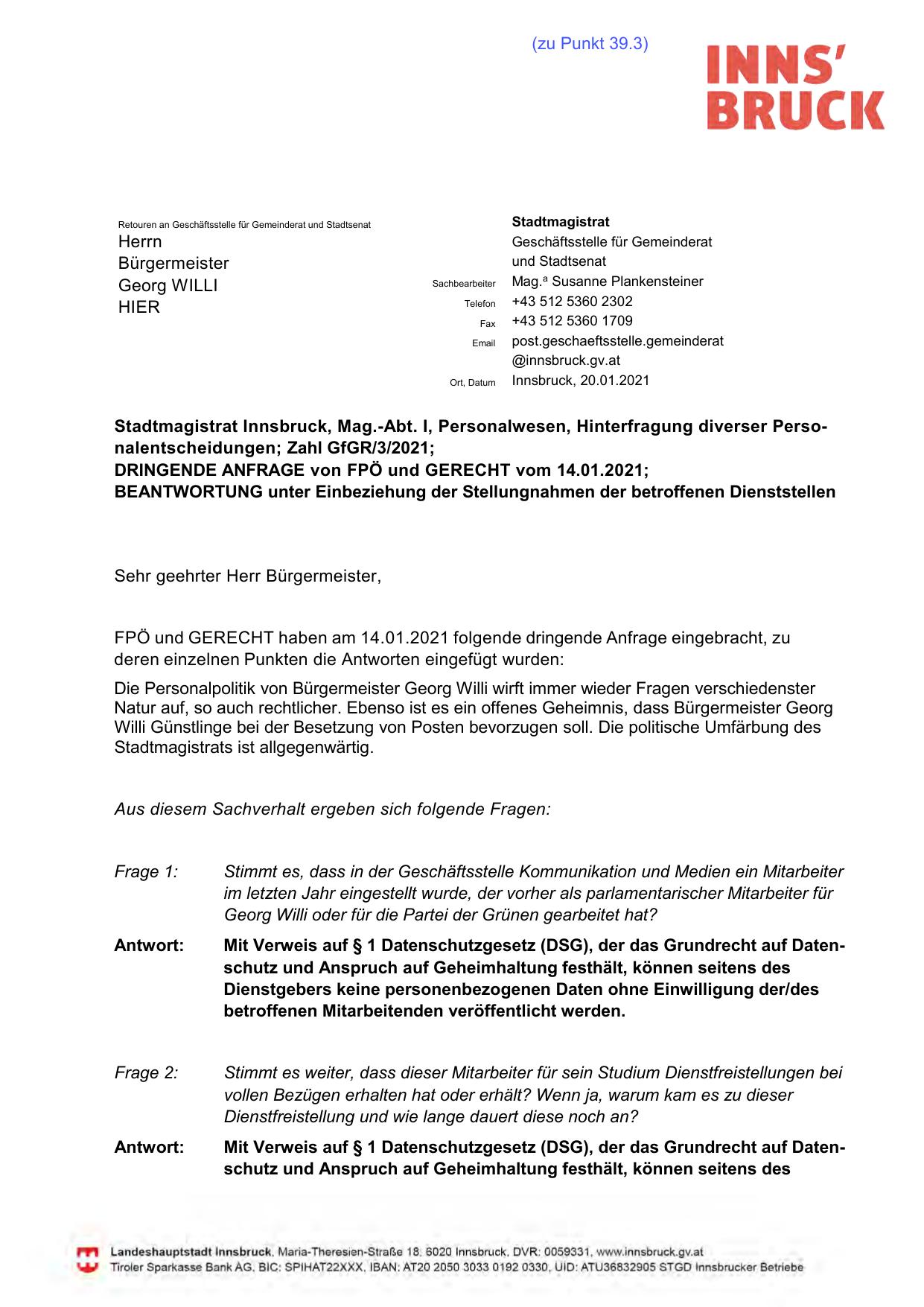 Stadtmagistrat Innsbruck, Mag.-Abt. I, Personalwesen, Hinterfragung diverser Personalentscheidungen; Zahl GfGR/3/2021;
