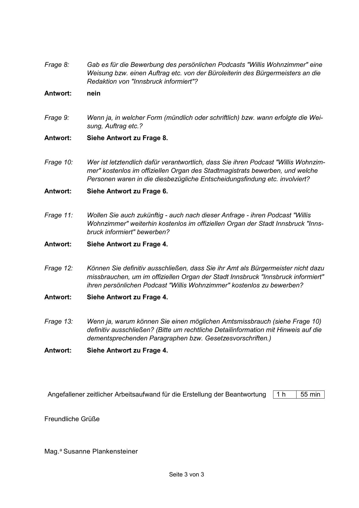 Wer ist letztendlich dafür verantwortlich, dass Sie ihren Podcast "Willis Wohnzimmer" kostenlos im offiziellen Organ des Stadtmagistrats bewerben, und welche