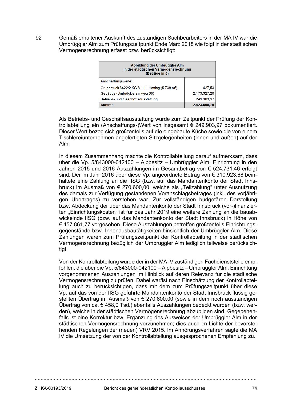 Übertrag von ca. € 458,0 Tsd.) ebenfalls Auszahlungen bedeckt wurden (bzw. werden), welche in der städtischen Vermögensrechnung abzubilden sind. Gegebenenfalls ist eine Korrektur bzw. Ergänzung des Ausweises der Umbrüggler Alm in der
