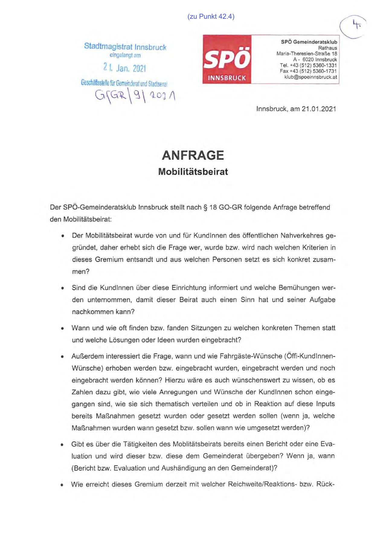 Der SPÖ-Gemeinderatsklub Innsbruck stellt nach § 18 GO-GR folgende Anfrage betreffend