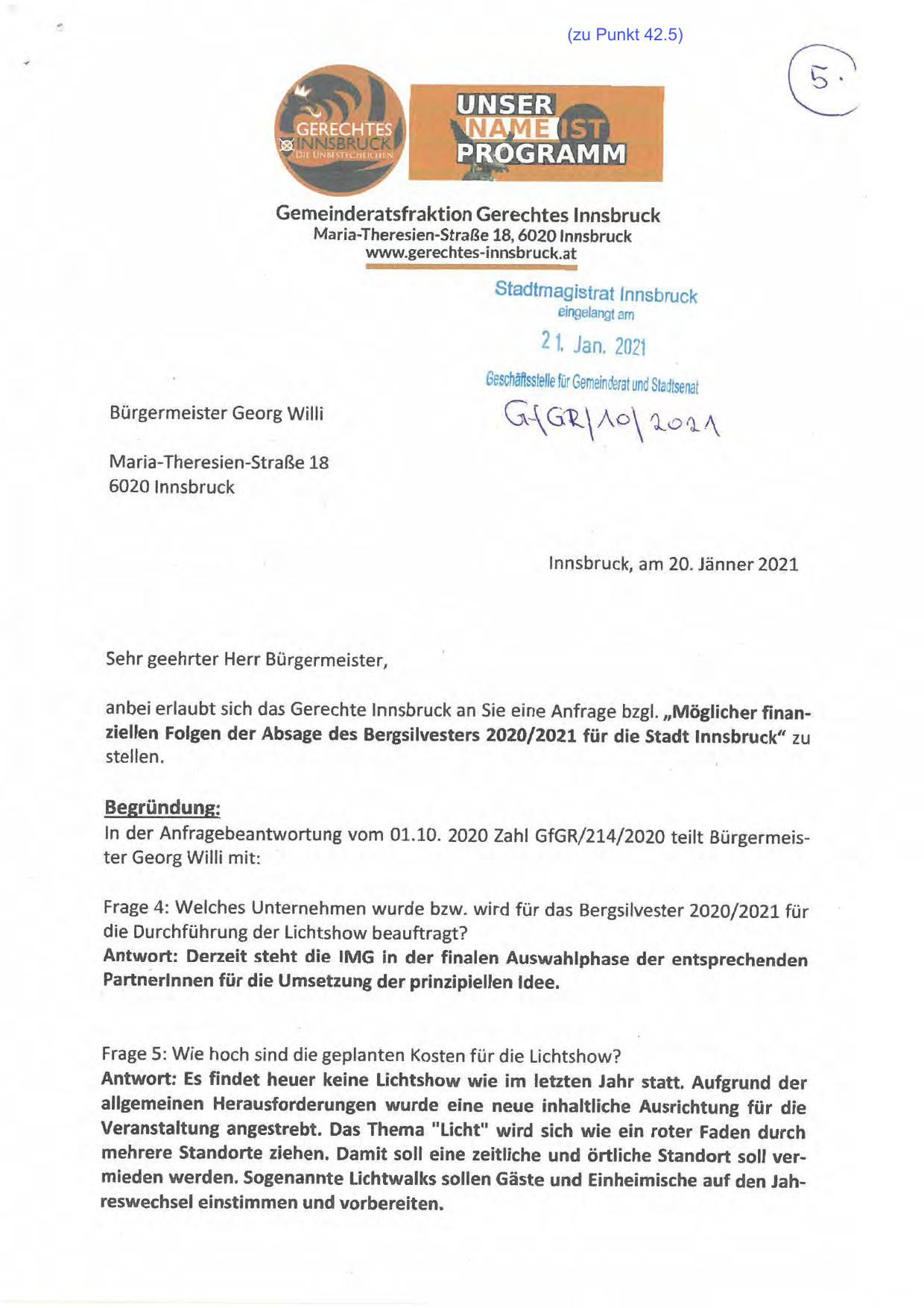 anbei erlaubt sich das Gerechte Innsbruck an Sie eine Anfrage bzgl. ,,Möglicher finanziellen Folgen der Absage des Bergsilvesters 2020/2021 für die Stadt Innsbruck" zu