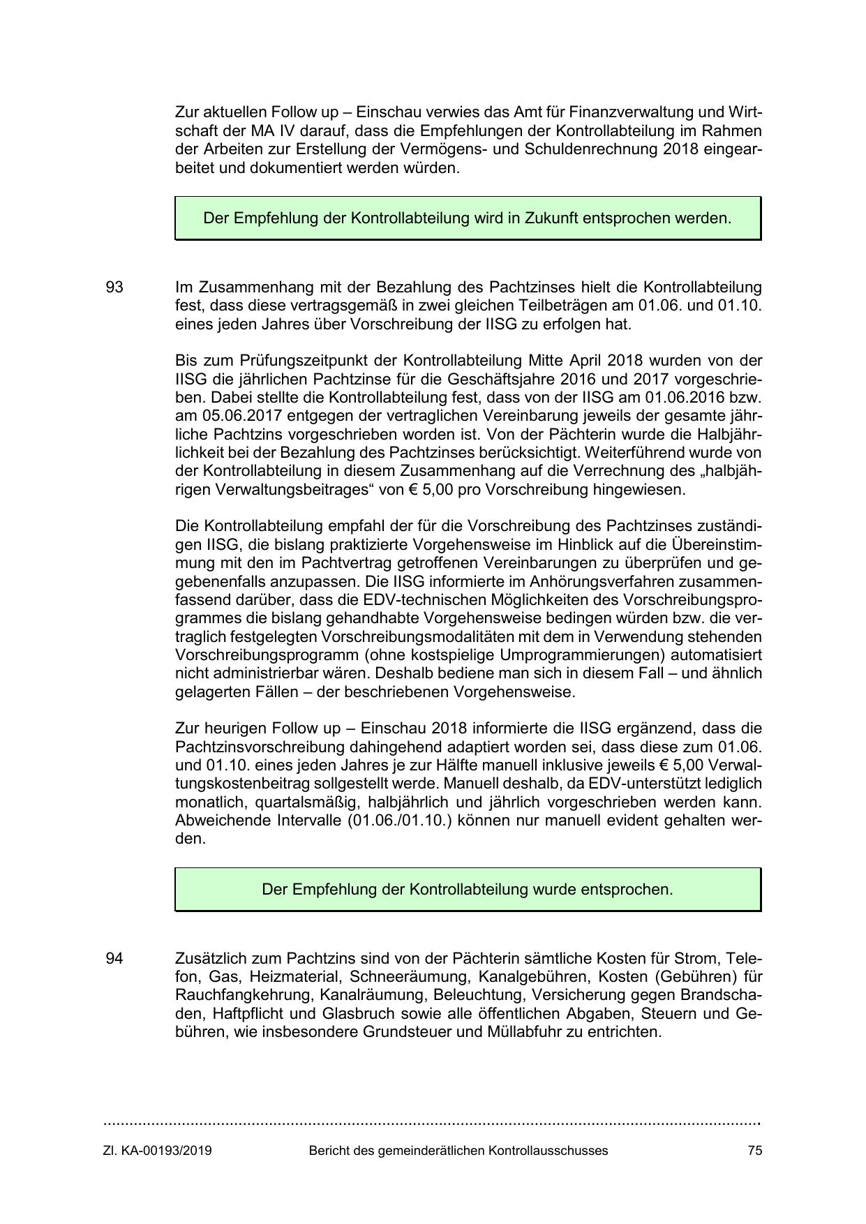 Die Kontrollabteilung empfahl der für die Vorschreibung des Pachtzinses zuständigen IISG, die bislang praktizierte Vorgehensweise im Hinblick auf die Übereinstimmung mit den im Pachtvertrag getroffenen Vereinbarungen zu überprüfen und gegebenenfalls anzupassen. Die IISG informierte im Anhörungsverfahren zusammenfassend darüber, dass die EDV-technischen Möglichkeiten des Vorschreibungsprogrammes die bislang gehandhabte Vorgehensweise bedingen würden bzw. die vertraglich festgelegten Vorschreibungsmodalitäten mit dem in Verwendung stehenden