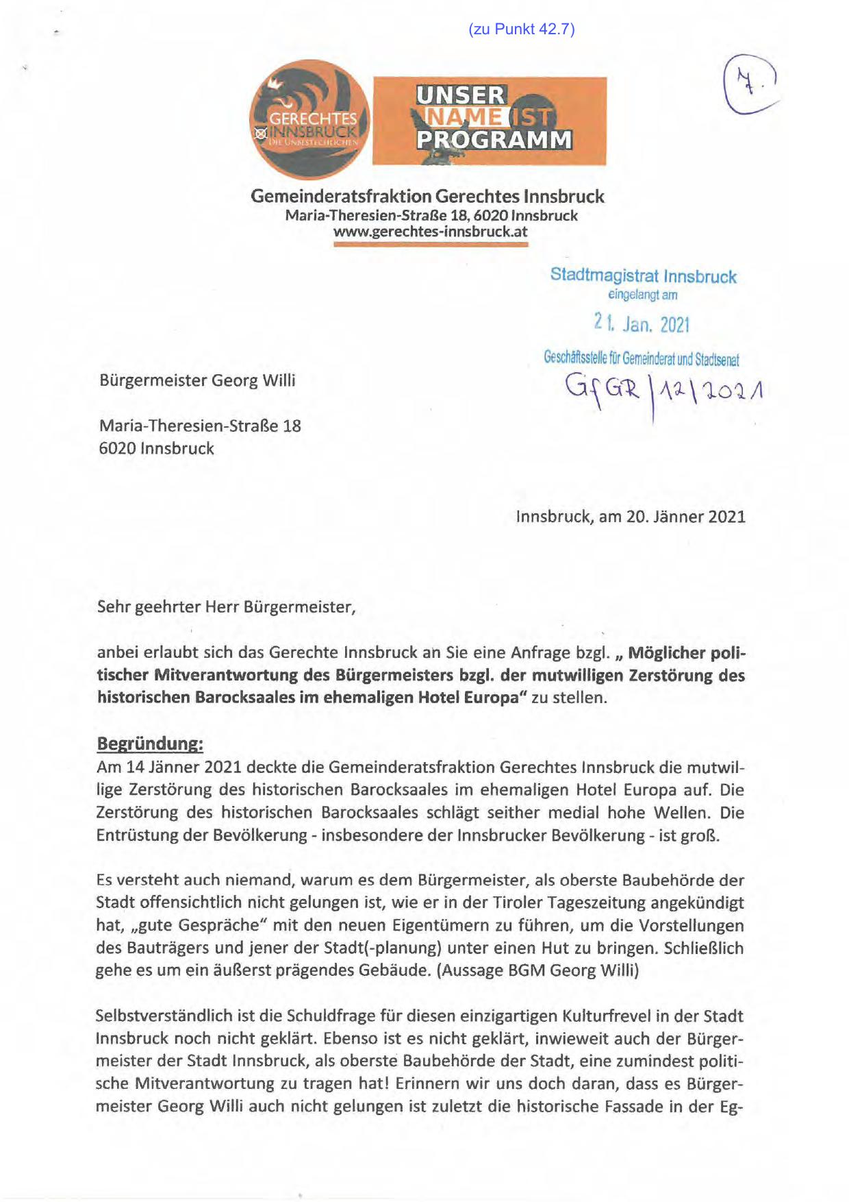 anbei erlaubt sich das Gerechte Innsbruck an Sie eine Anfrage bzgl. ,, Möglicher politischer Mitverantwortung des Bürgermeisters bzgl. der mutwilligen Zerstörung des