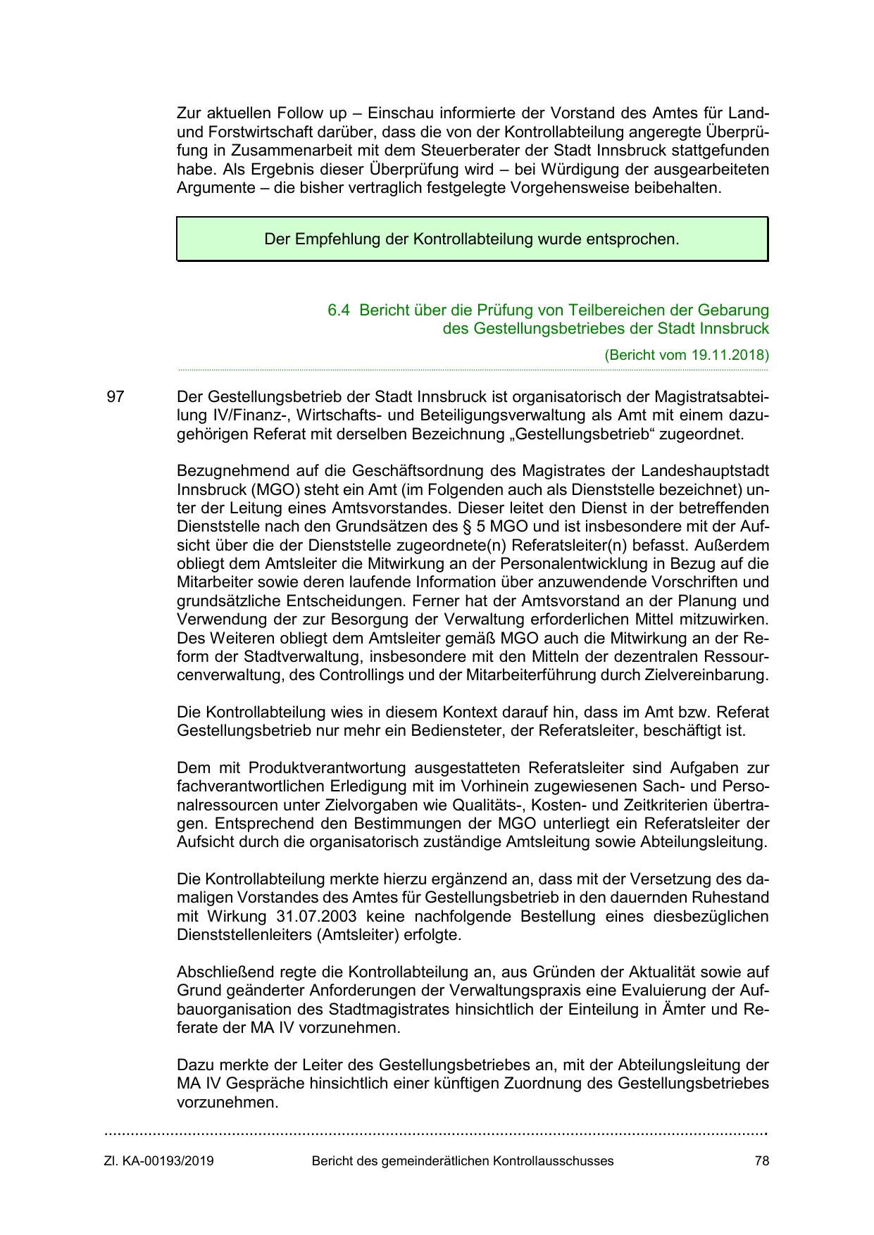 Zur aktuellen Follow up – Einschau informierte der Vorstand des Amtes für Landund Forstwirtschaft darüber, dass die von der Kontrollabteilung angeregte Überprüfung in Zusammenarbeit mit dem Steuerberater der Stadt Innsbruck stattgefunden