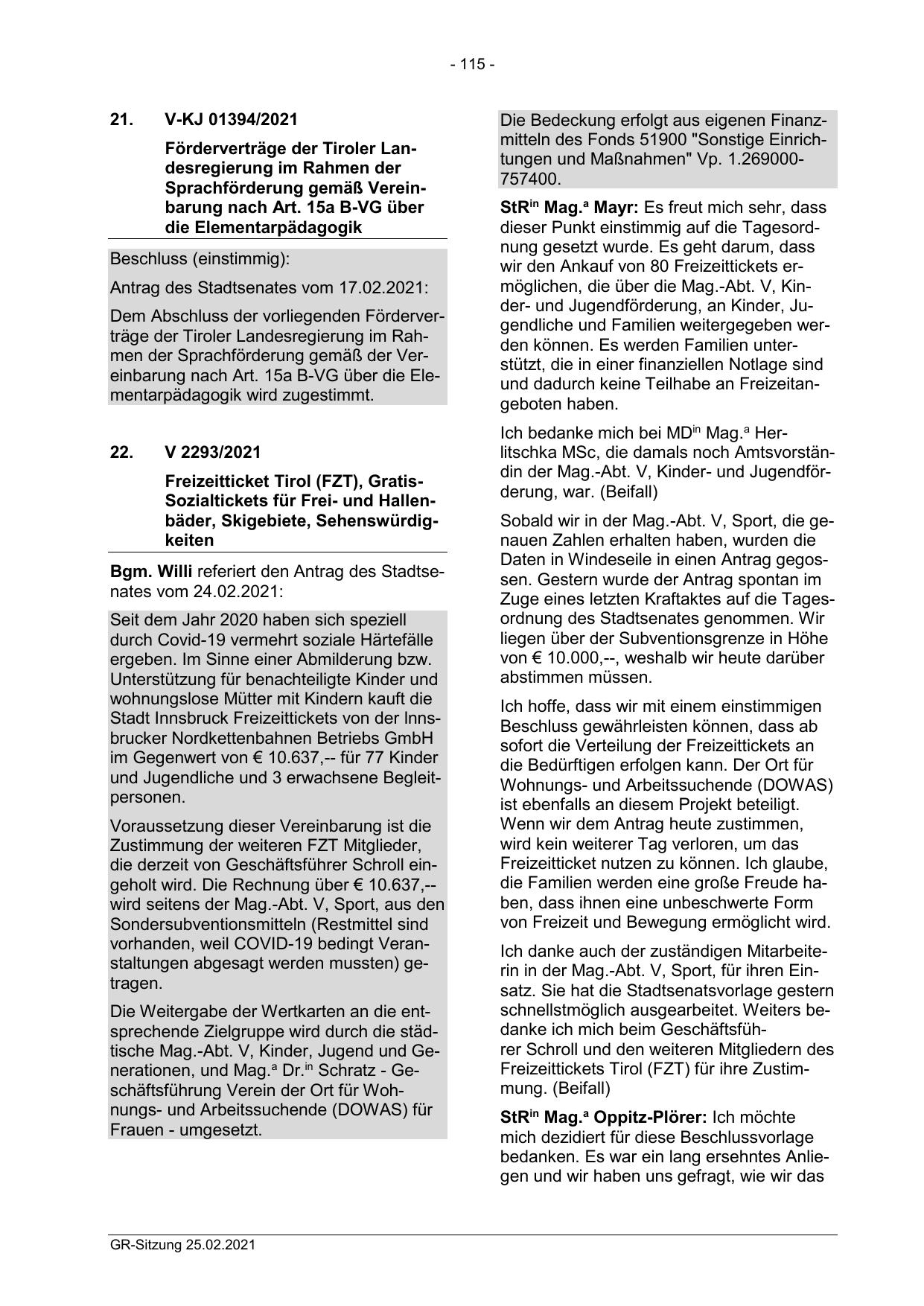 Dem Abschluss der vorliegenden Förderverträge der Tiroler Landesregierung im Rahmen der Sprachförderung gemäß der Vereinbarung nach Art. 15a B-VG über die Elementarpädagogik wird zugestimmt.