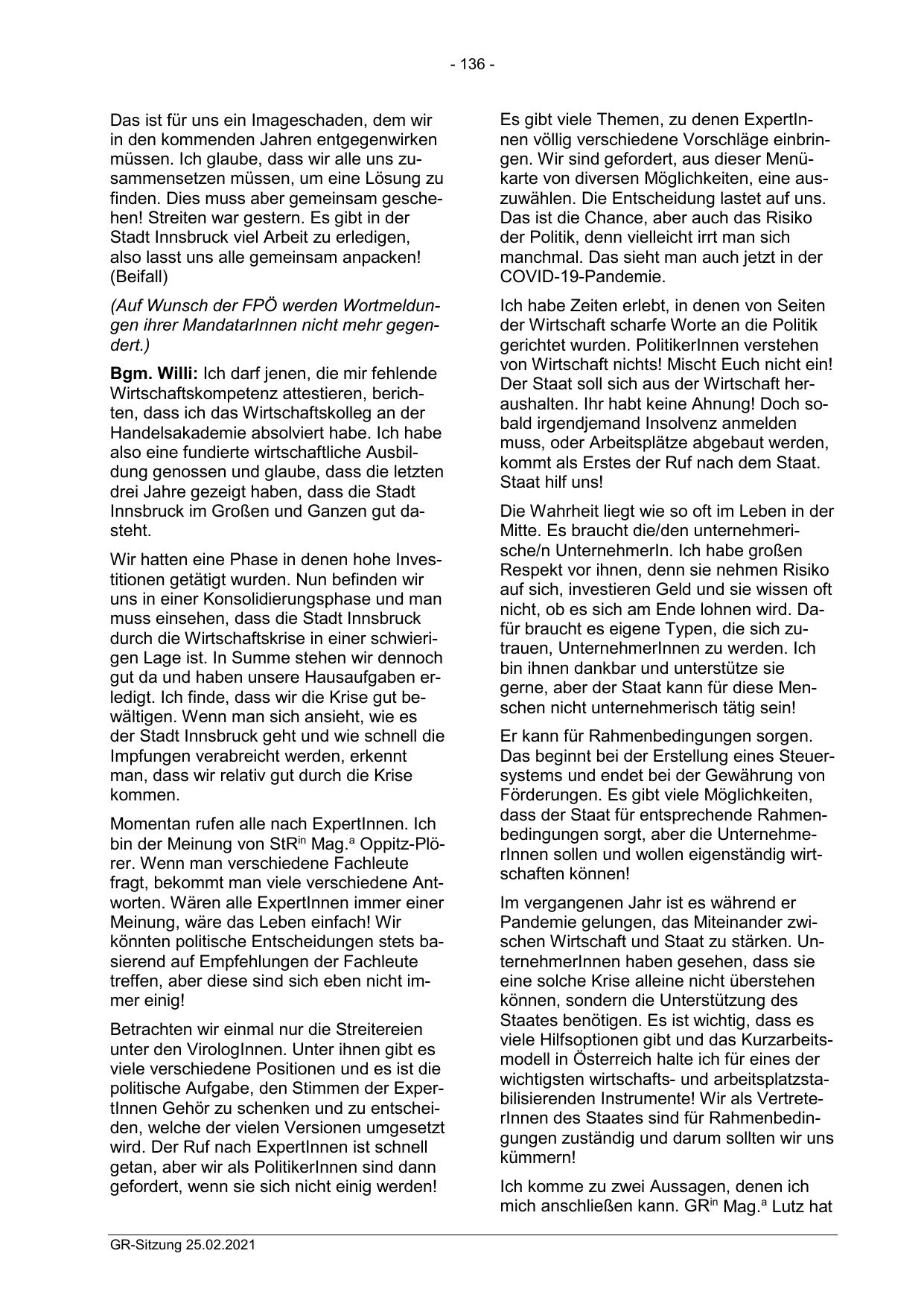 (Auf Wunsch der FPÖ werden Wortmeldungen ihrer MandatarInnen nicht mehr gegendert.)