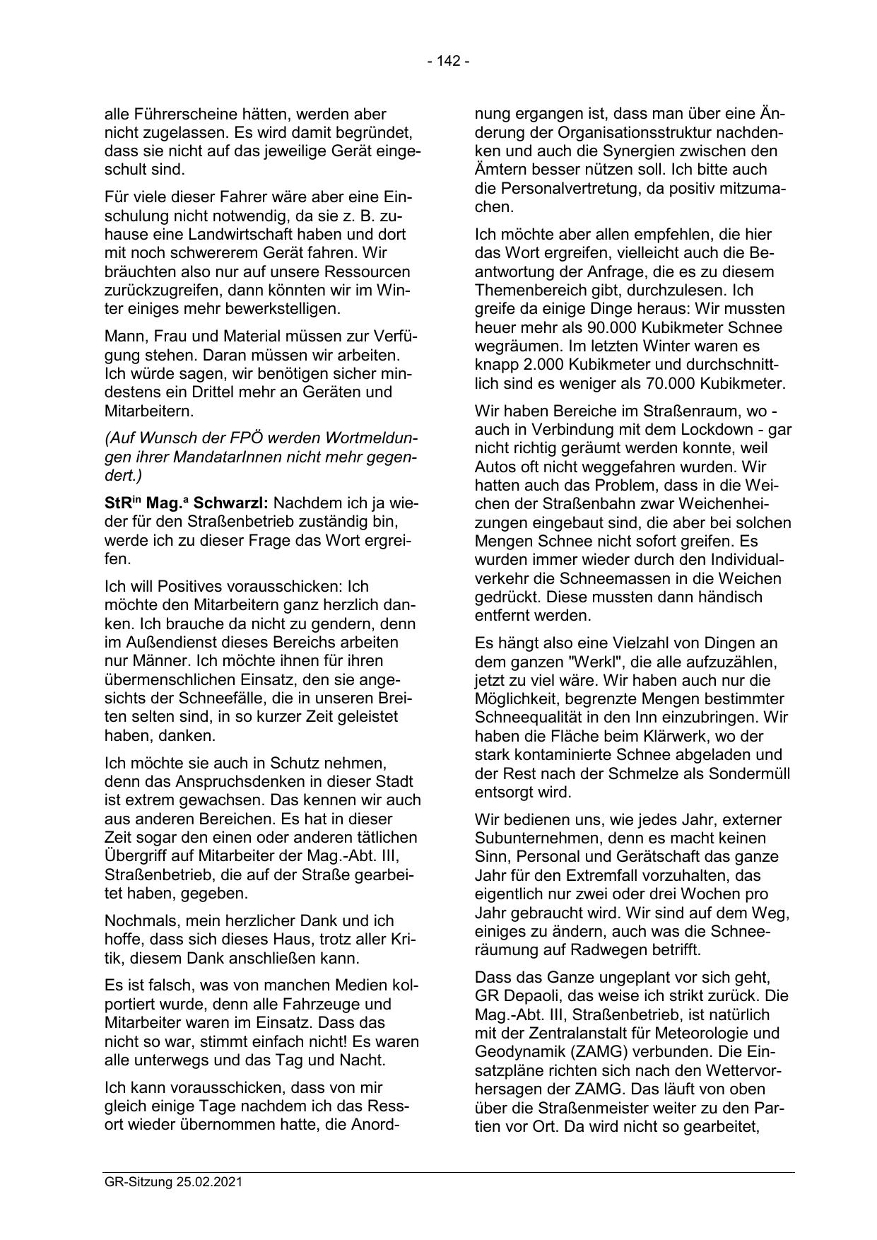 StRin Mag.a Schwarzl: Nachdem ich ja wieder für den Straßenbetrieb zuständig bin,