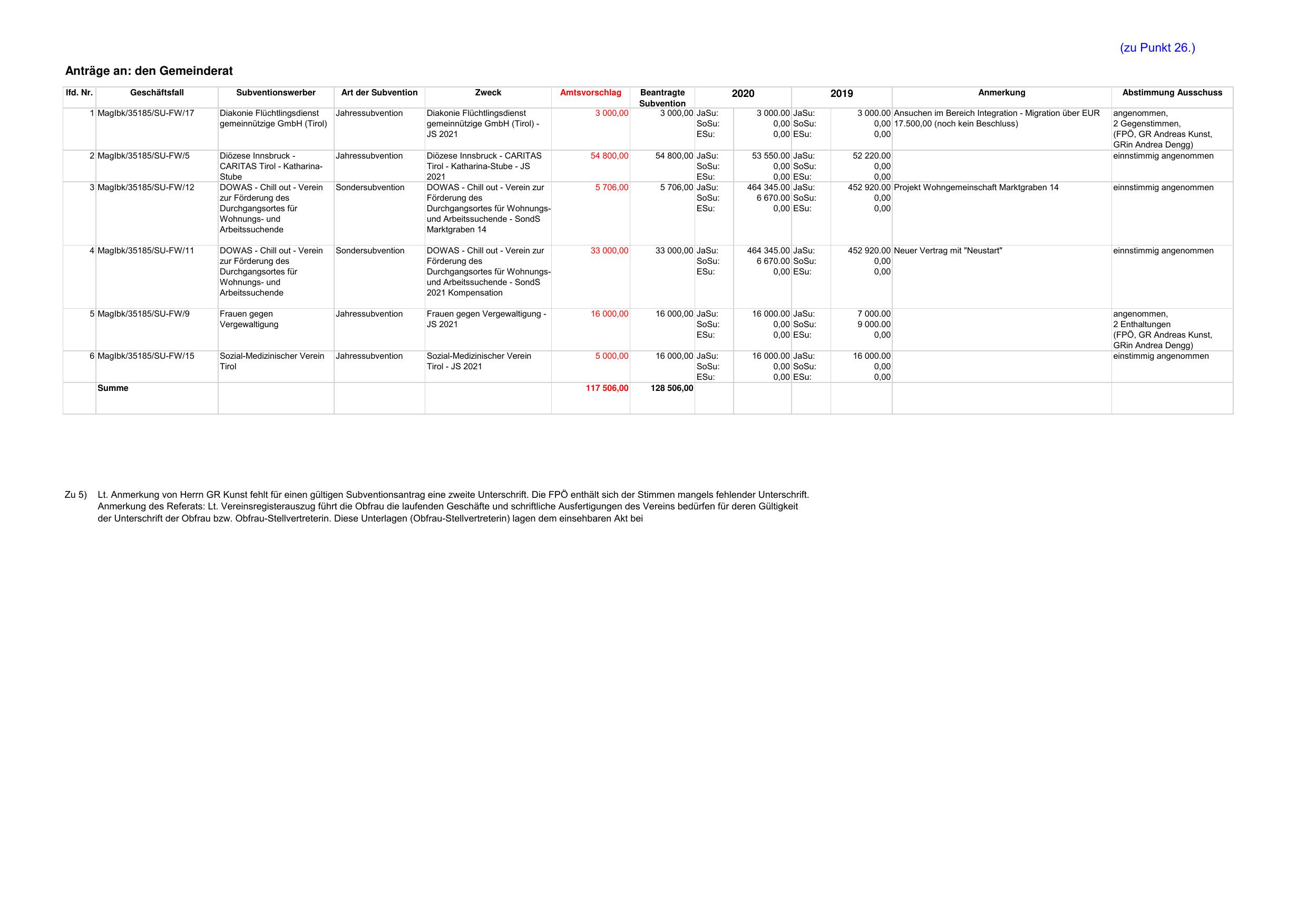 Lt. Anmerkung von Herrn GR Kunst fehlt für einen gültigen Subventionsantrag eine zweite Unterschrift. Die FPÖ enthält sich der Stimmen mangels fehlender Unterschrift.