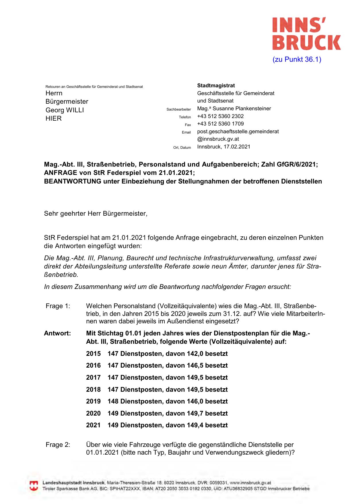 Mag.-Abt. III, Straßenbetrieb, Personalstand und Aufgabenbereich; Zahl GfGR/6/2021;