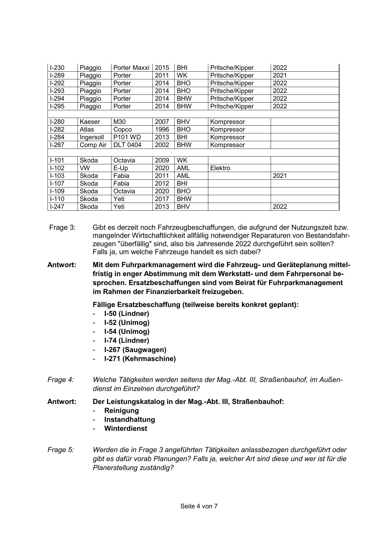 Mit dem Fuhrparkmanagement wird die Fahrzeug- und Geräteplanung mittelfristig in enger Abstimmung mit dem Werkstatt- und dem Fahrpersonal besprochen. Ersatzbeschaffungen sind vom Beirat für Fuhrparkmanagement