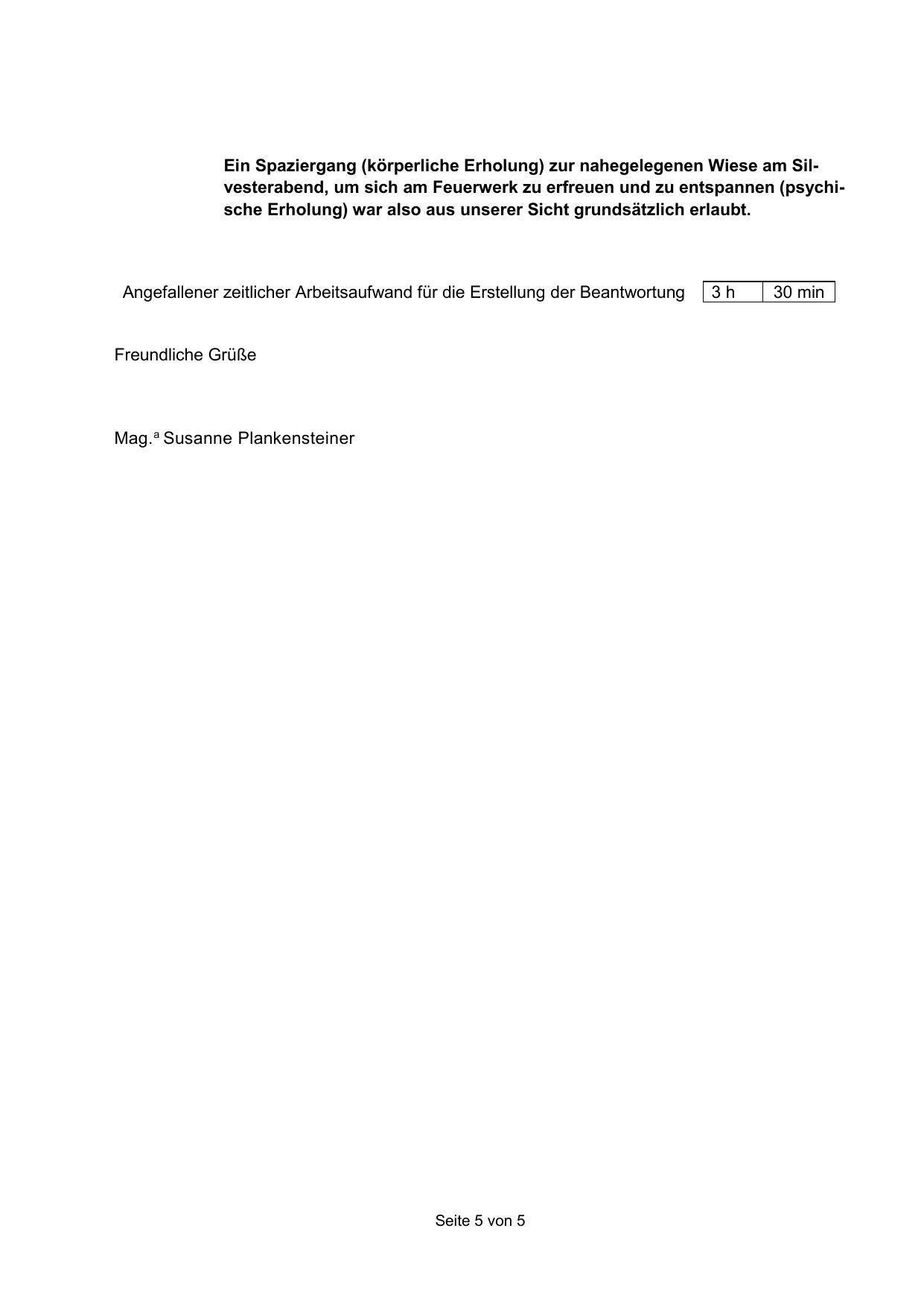 Ein Spaziergang (körperliche Erholung) zur nahegelegenen Wiese am Silvesterabend, um sich am Feuerwerk zu erfreuen und zu entspannen (psychische Erholung) war also aus unserer Sicht grundsätzlich erlaubt.