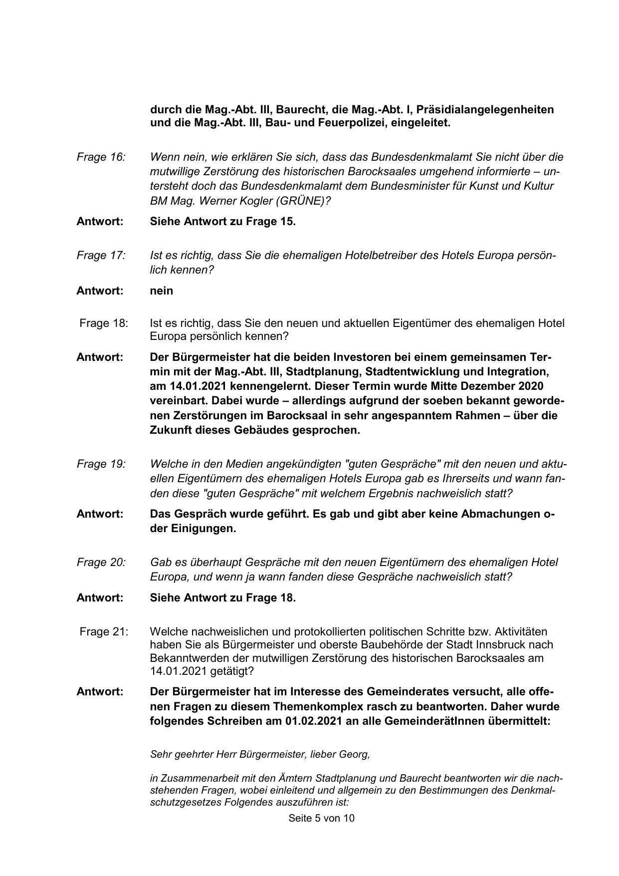 Der Bürgermeister hat im Interesse des Gemeinderates versucht, alle offenen Fragen zu diesem Themenkomplex rasch zu beantworten. Daher wurde