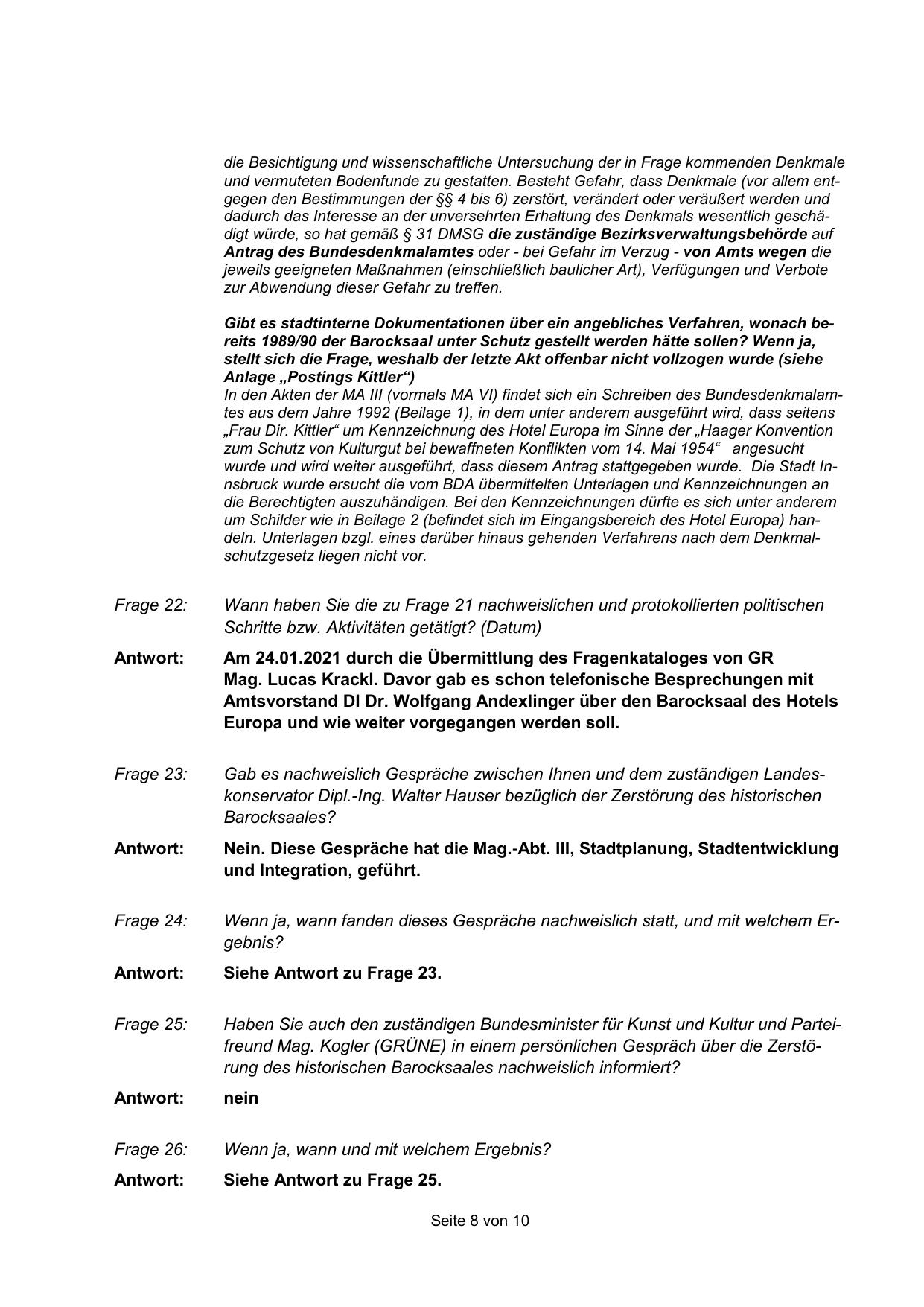 Gab es nachweislich Gespräche zwischen Ihnen und dem zuständigen Landeskonservator Dipl.-Ing. Walter Hauser bezüglich der Zerstörung des historischen