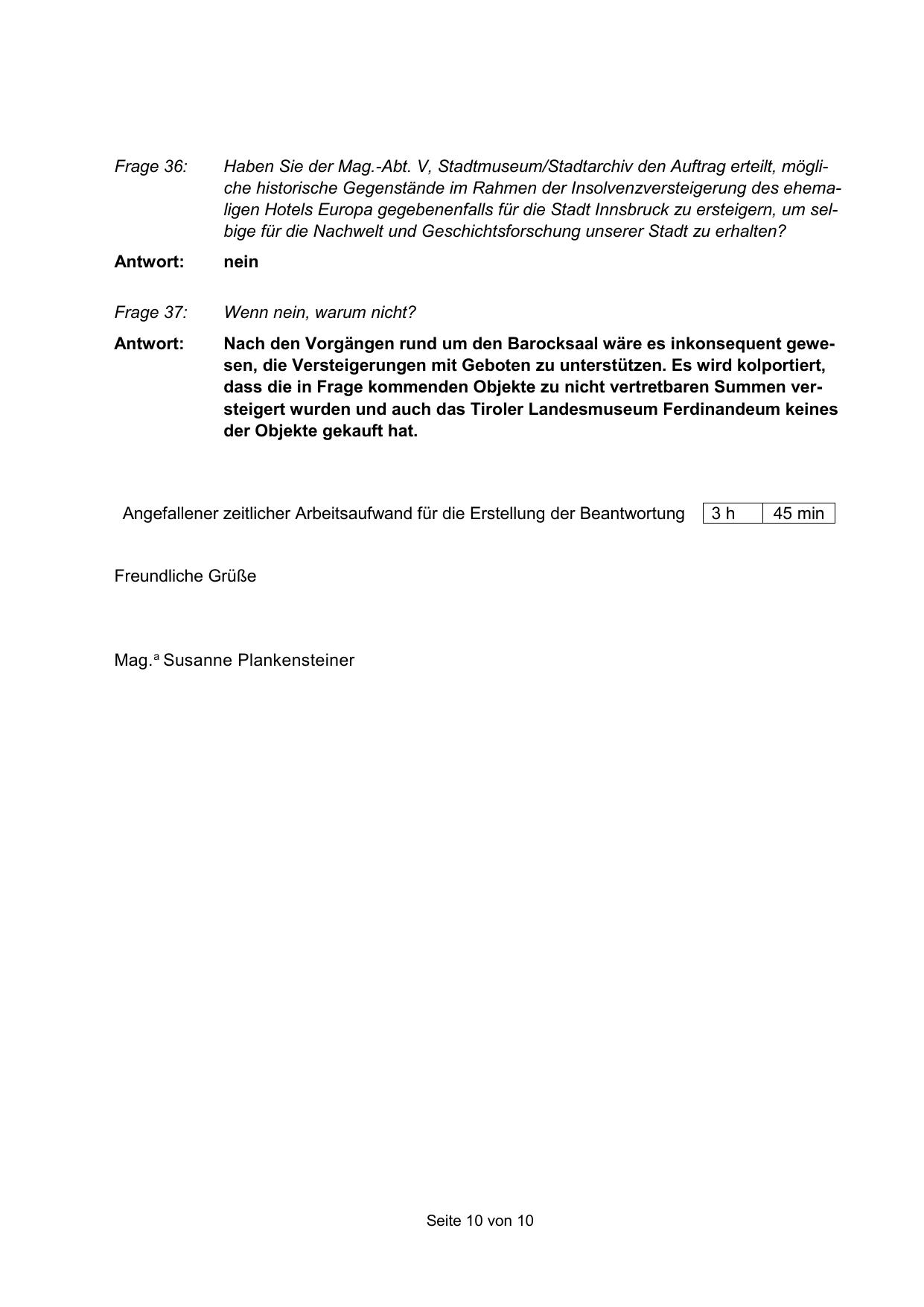 Haben Sie der Mag.-Abt. V, Stadtmuseum/Stadtarchiv den Auftrag erteilt, mögliche historische Gegenstände im Rahmen der Insolvenzversteigerung des ehemaligen Hotels Europa gegebenenfalls für die Stadt Innsbruck zu ersteigern, um selbige für die Nachwelt und Geschichtsforschung unserer Stadt zu erhalten?