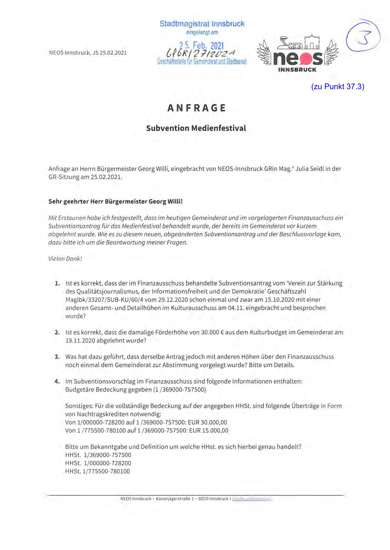 Anfrage an Herrn Bürgermeister Georg Willi , eingebracht von NEOS-lnnsbruck GRin Mag." Julia Seidl in der