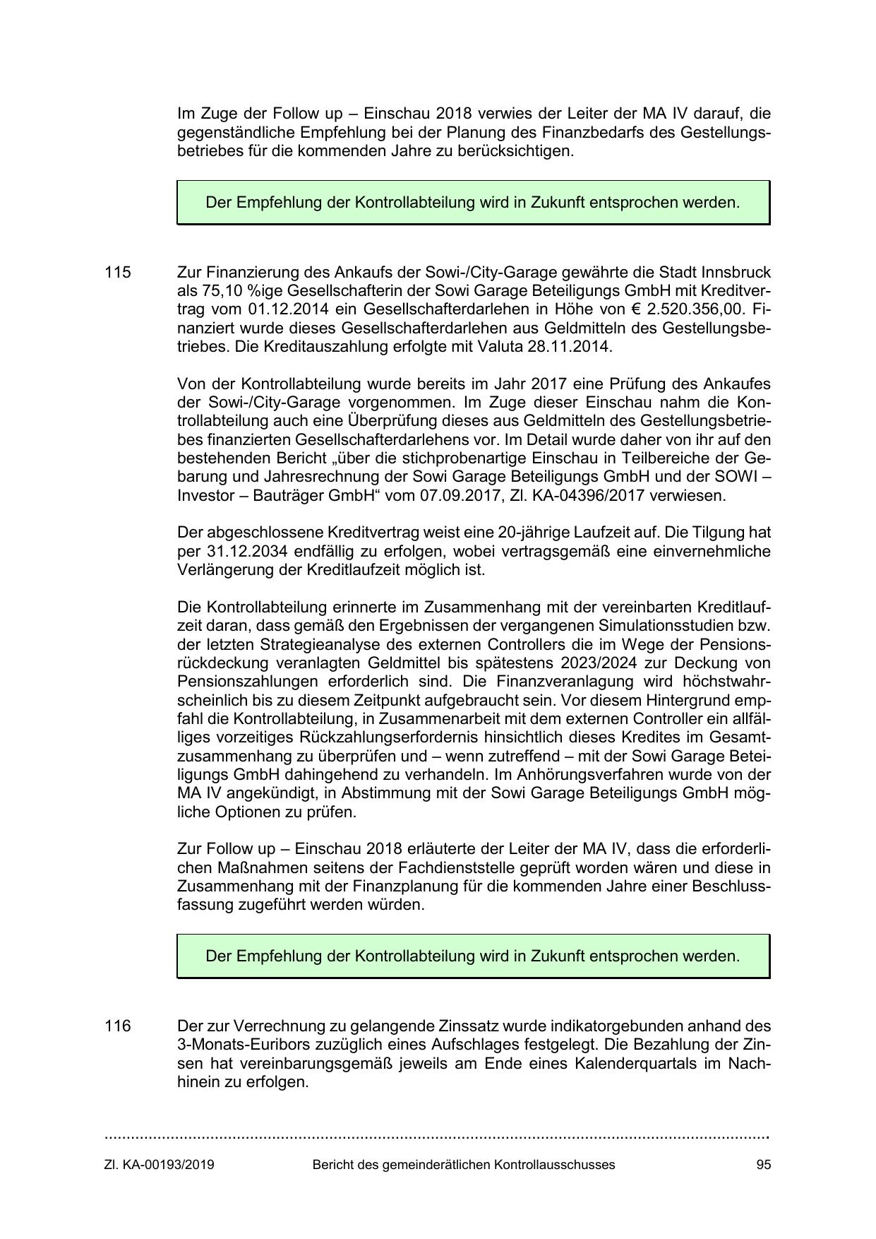 Pensionszahlungen erforderlich sind. Die Finanzveranlagung wird höchstwahrscheinlich bis zu diesem Zeitpunkt aufgebraucht sein. Vor diesem Hintergrund empfahl die Kontrollabteilung, in Zusammenarbeit mit dem externen Controller ein allfälliges vorzeitiges Rückzahlungserfordernis hinsichtlich dieses Kredites im Gesamtzusammenhang zu überprüfen und – wenn zutreffend – mit der Sowi Garage Beteiligungs GmbH dahingehend zu verhandeln. Im Anhörungsverfahren wurde von der