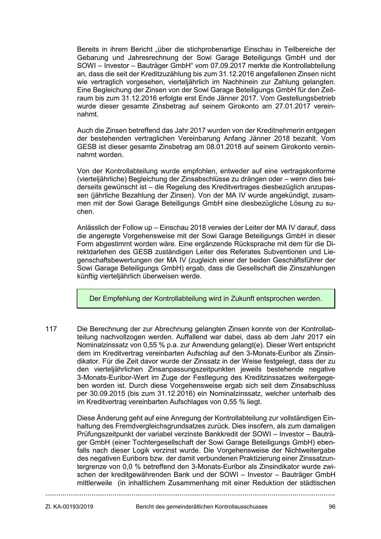 (vierteljährliche) Begleichung der Zinsabschlüsse zu drängen oder – wenn dies beiderseits gewünscht ist – die Regelung des Kreditvertrages diesbezüglich anzupassen (jährliche Bezahlung der Zinsen). Von der MA IV wurde angekündigt, zusammen mit der Sowi Garage Beteiligungs GmbH eine diesbezügliche Lösung zu suchen.