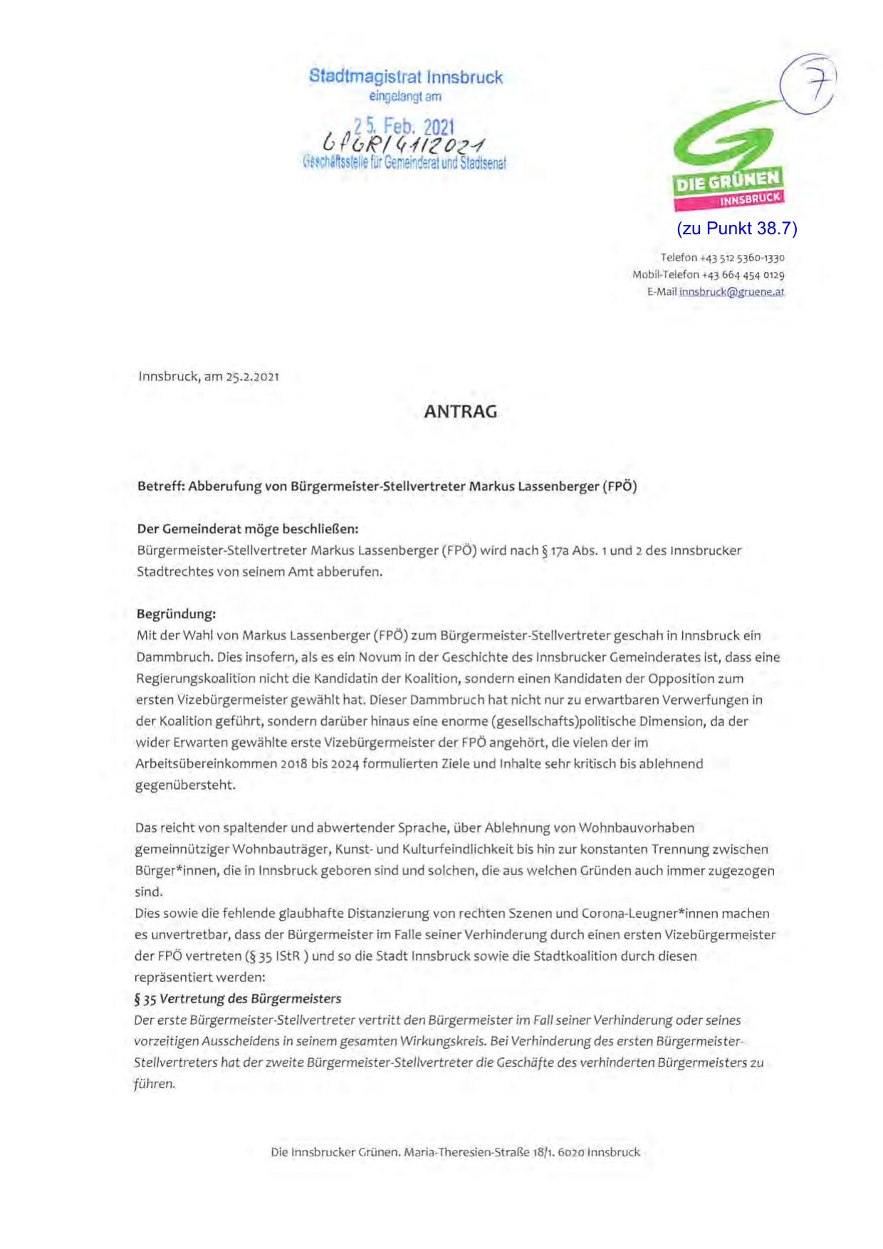 Bürgermeister-Stellvertreter Markus Lassenberger (FPÖ) wird nach§ 17a Abs. 1 und 2 des lnnsbrucker