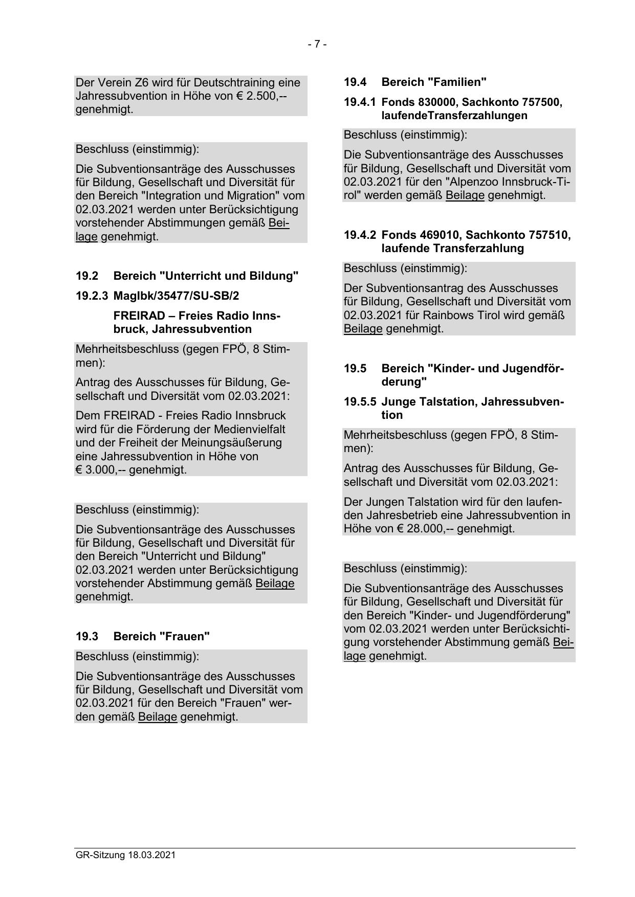 Mehrheitsbeschluss (gegen FPÖ, 8 Stimmen):