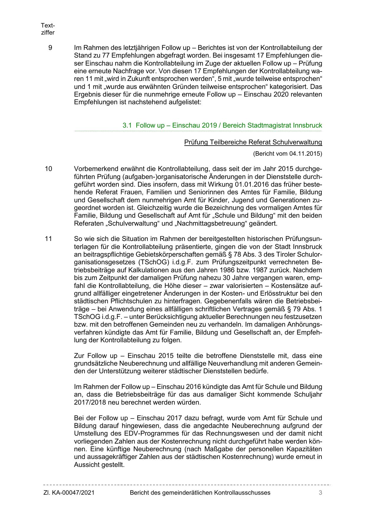 3.1 Follow up – Einschau 2019 / Bereich Stadtmagistrat Innsbruck