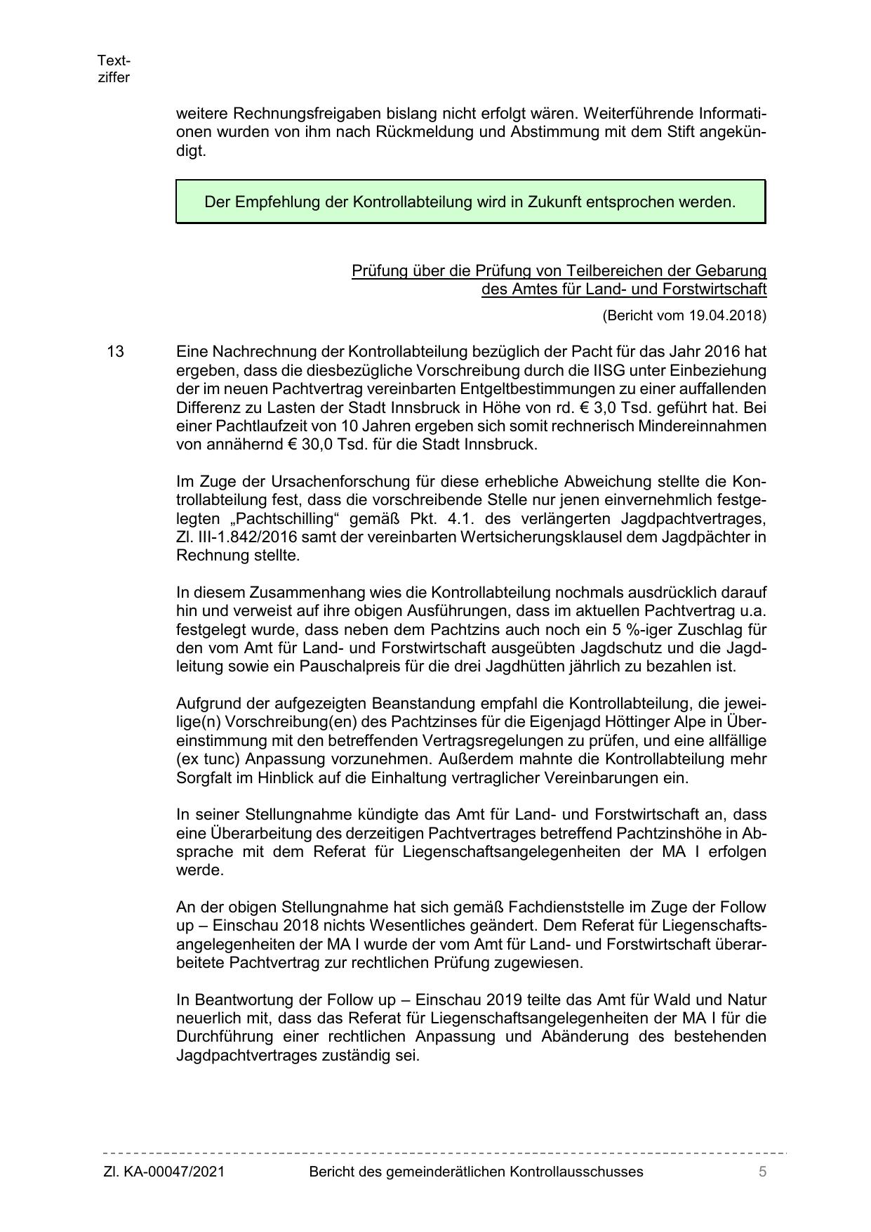 Aufgrund der aufgezeigten Beanstandung empfahl die Kontrollabteilung, die jeweilige(n) Vorschreibung(en) des Pachtzinses für die Eigenjagd Höttinger Alpe in Übereinstimmung mit den betreffenden Vertragsregelungen zu prüfen, und eine allfällige