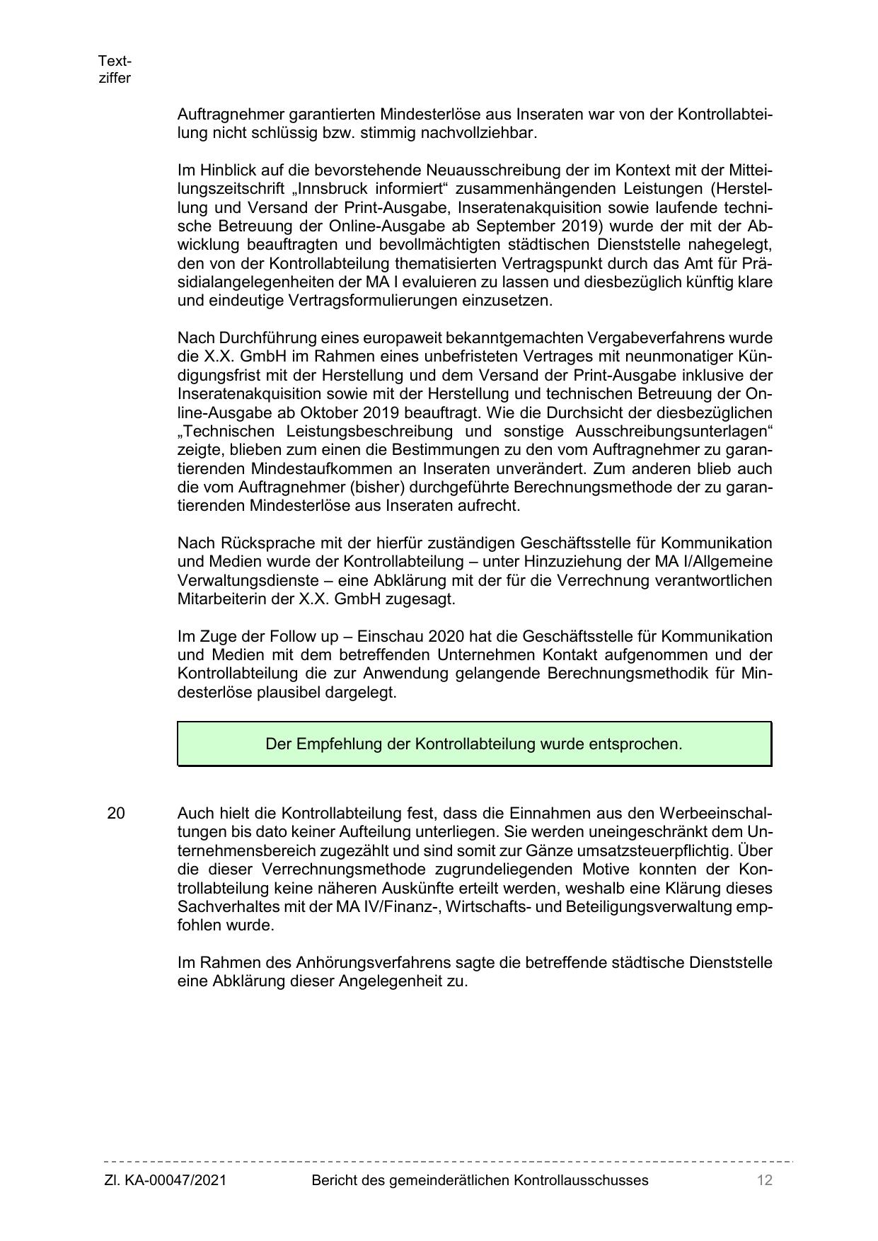 Im Hinblick auf die bevorstehende Neuausschreibung der im Kontext mit der Mitteilungszeitschrift „Innsbruck informiert“ zusammenhängenden Leistungen (Herstellung und Versand der Print-Ausgabe, Inseratenakquisition sowie laufende technische Betreuung der Online-Ausgabe ab September 2019) wurde der mit der Abwicklung beauftragten und bevollmächtigten städtischen Dienststelle nahegelegt,