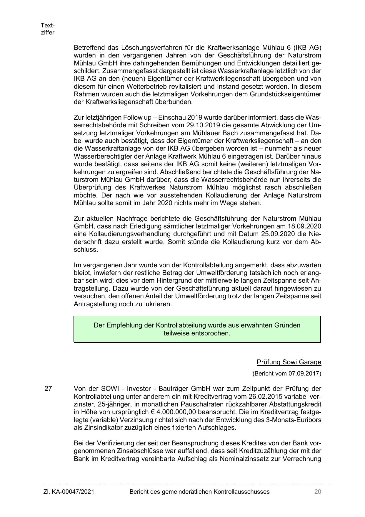 wurde bestätigt, dass seitens der IKB AG somit keine (weiteren) letztmaligen Vorkehrungen zu ergreifen sind. Abschließend berichtete die Geschäftsführung der Naturstrom Mühlau GmbH darüber, dass die Wasserrechtsbehörde nun ihrerseits die