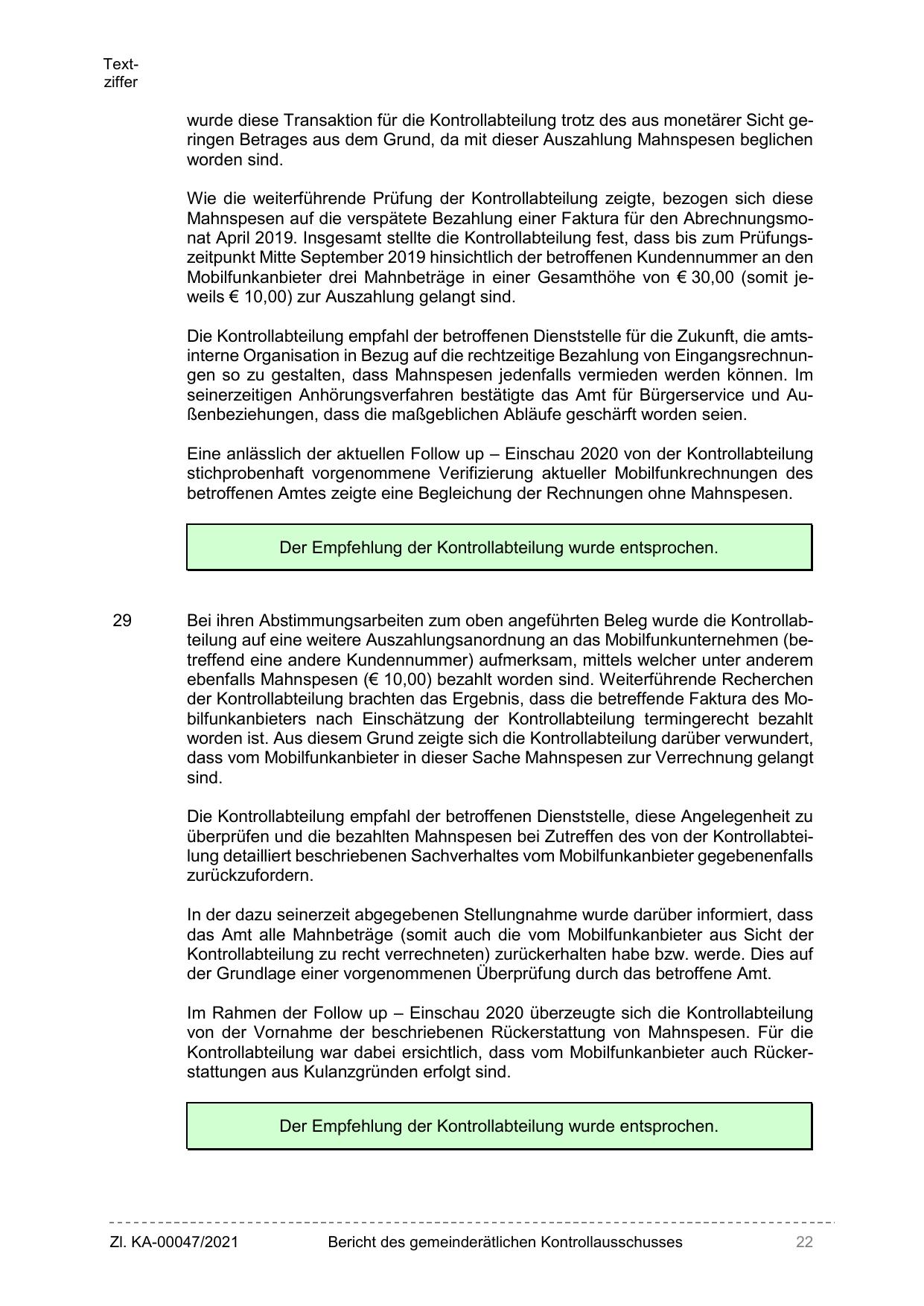 Die Kontrollabteilung empfahl der betroffenen Dienststelle für die Zukunft, die amtsinterne Organisation in Bezug auf die rechtzeitige Bezahlung von Eingangsrechnungen so zu gestalten, dass Mahnspesen jedenfalls vermieden werden können. Im