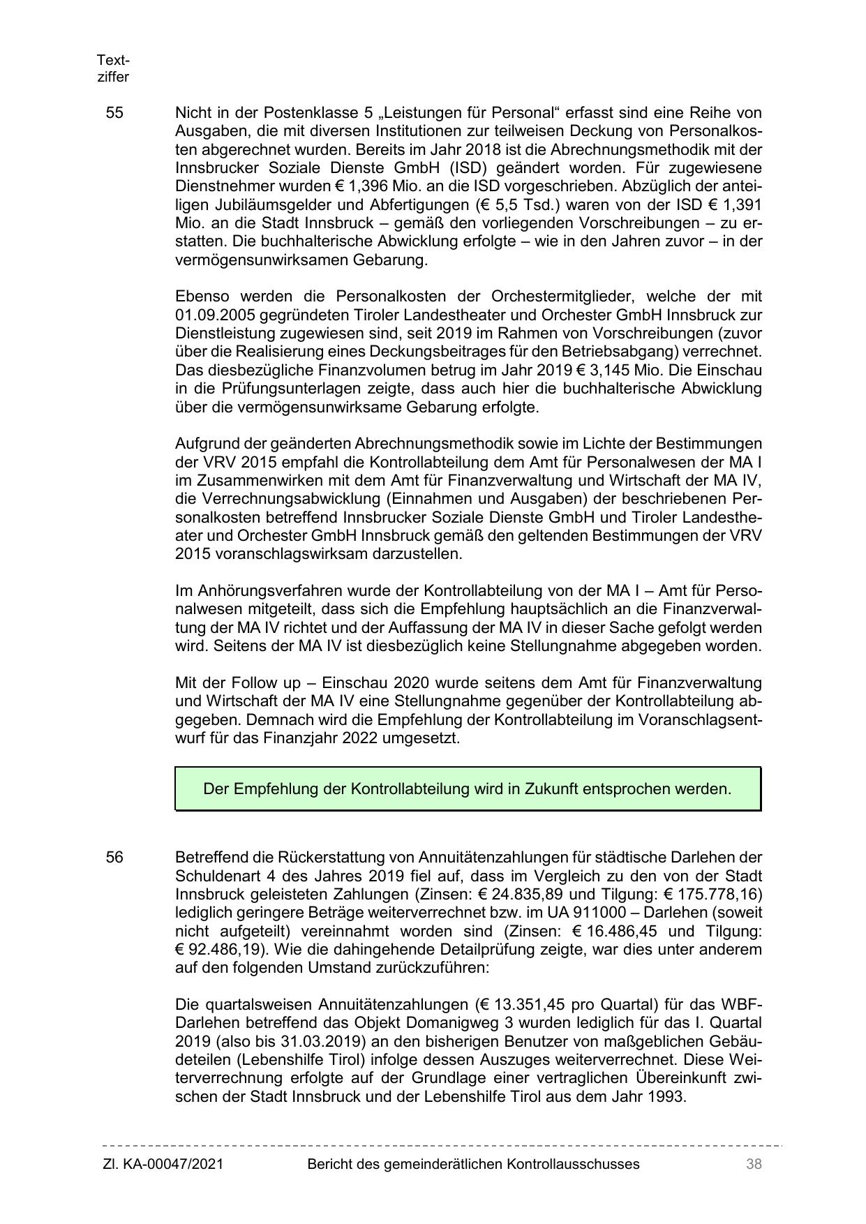 und Wirtschaft der MA IV eine Stellungnahme gegenüber der Kontrollabteilung abgegeben. Demnach wird die Empfehlung der Kontrollabteilung im Voranschlagsentwurf für das Finanzjahr 2022 umgesetzt.