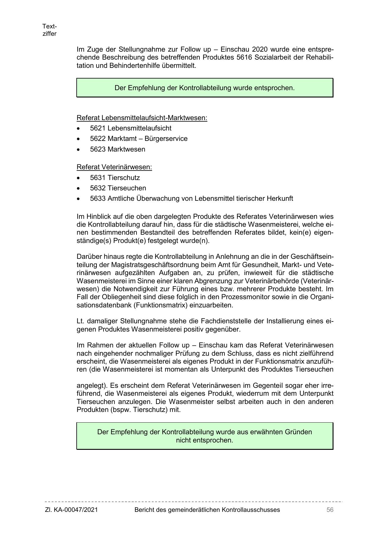 die Kontrollabteilung darauf hin, dass für die städtische Wasenmeisterei, welche einen bestimmenden Bestandteil des betreffenden Referates bildet, kein(e) eigenständige(s) Produkt(e) festgelegt wurde(n).