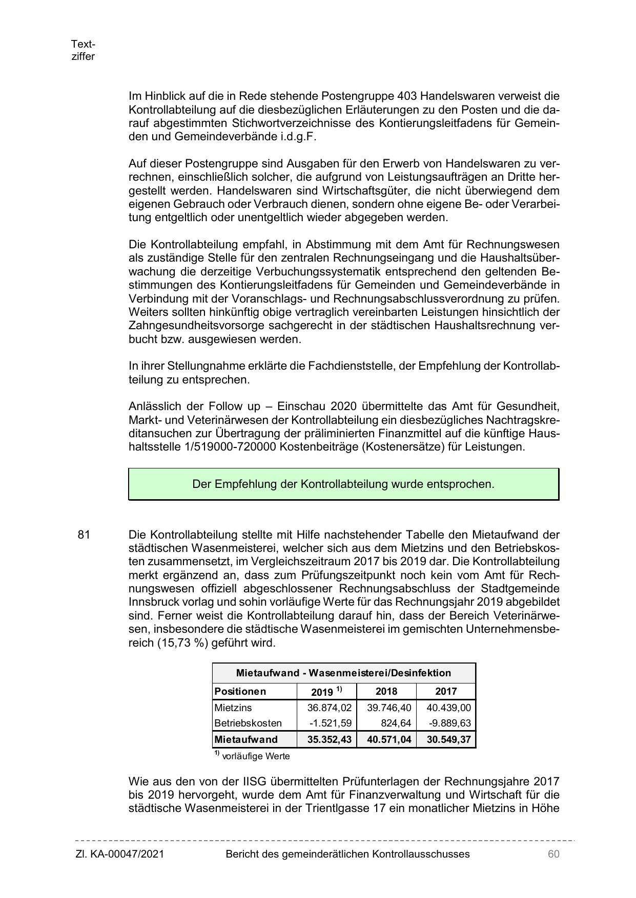 sind. Ferner weist die Kontrollabteilung darauf hin, dass der Bereich Veterinärwesen, insbesondere die städtische Wasenmeisterei im gemischten Unternehmensbereich (15,73 %) geführt wird.