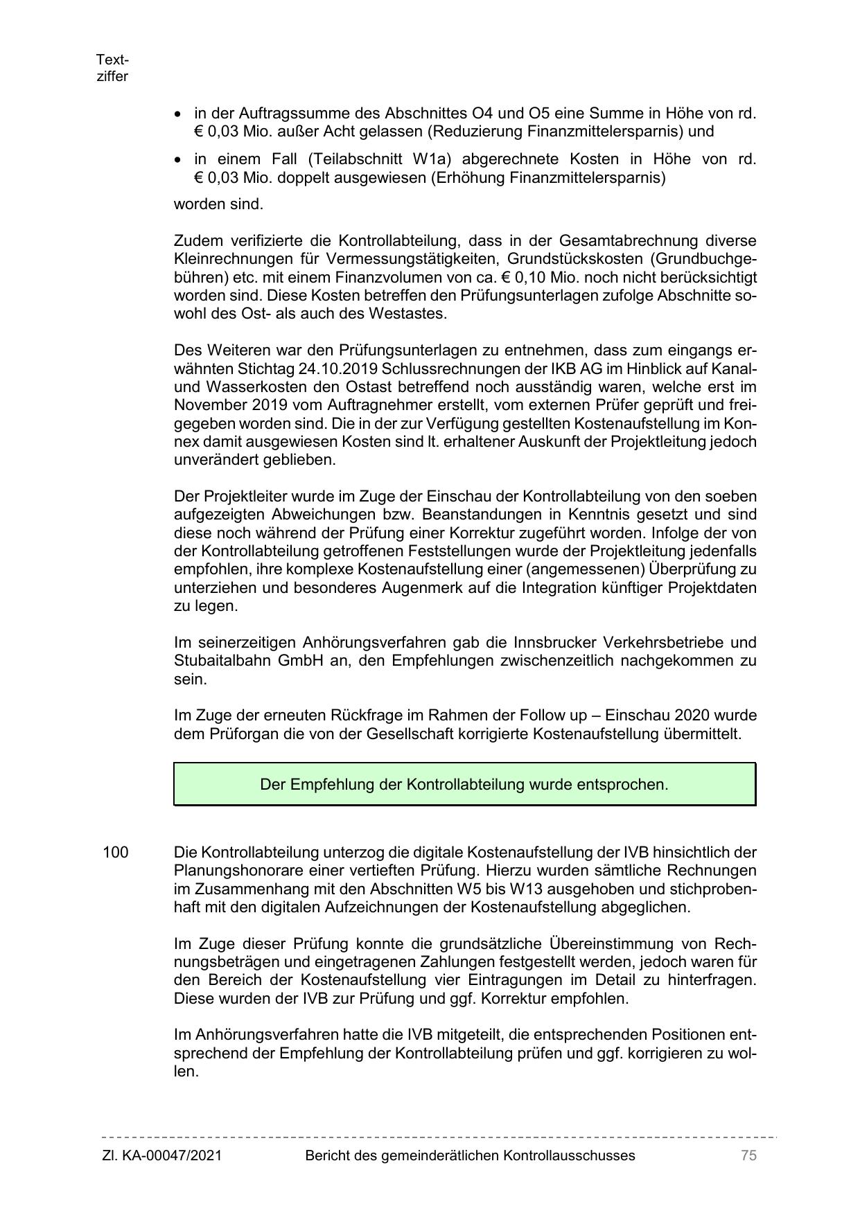 Des Weiteren war den Prüfungsunterlagen zu entnehmen, dass zum eingangs erwähnten Stichtag 24.10.2019 Schlussrechnungen der IKB AG im Hinblick auf Kanalund Wasserkosten den Ostast betreffend noch ausständig waren, welche erst im