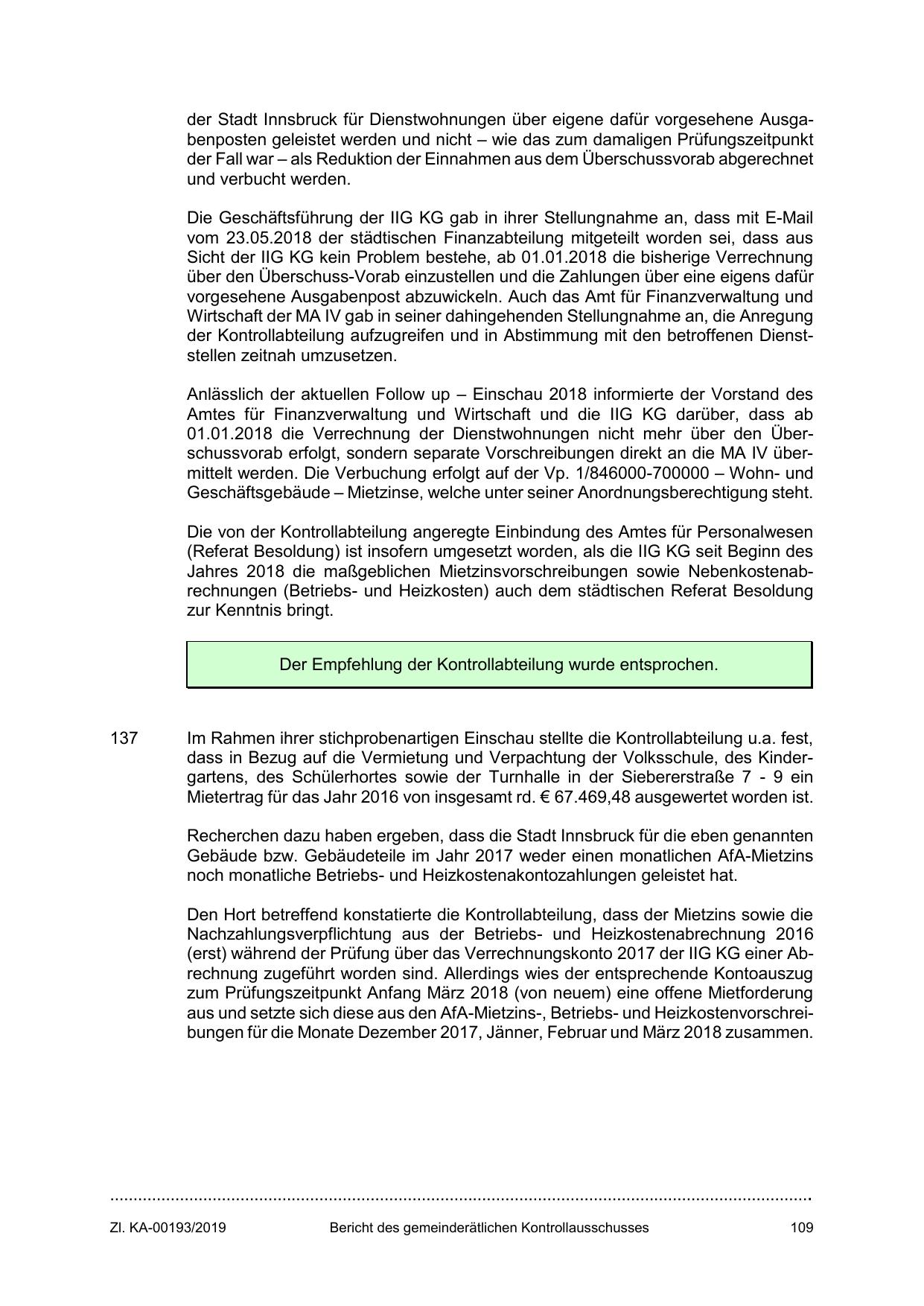 der Stadt Innsbruck für Dienstwohnungen über eigene dafür vorgesehene Ausgabenposten geleistet werden und nicht – wie das zum damaligen Prüfungszeitpunkt