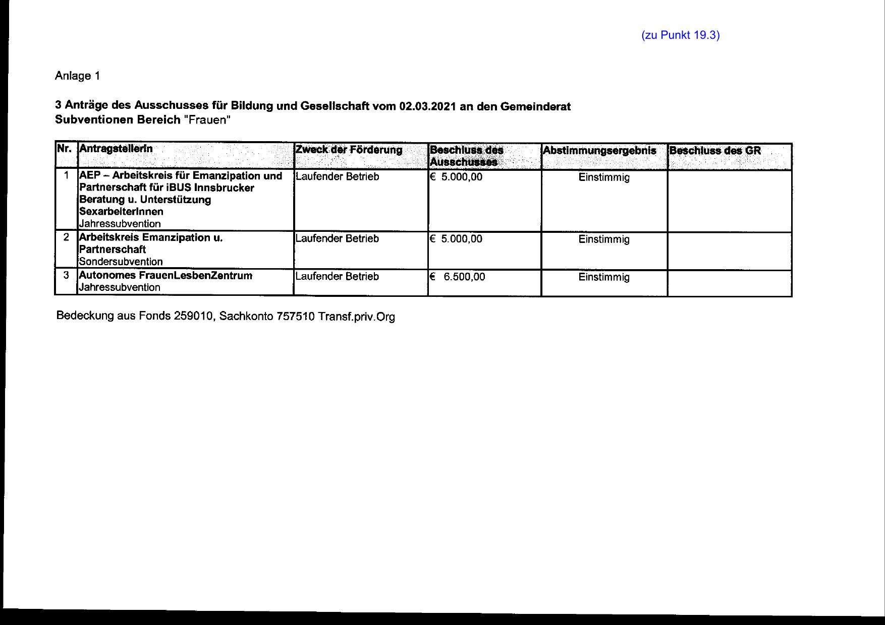 3 Anträge des Ausschusses für Bildung und Gesellschaft vom 02.03.2021 an den Gemeinderat