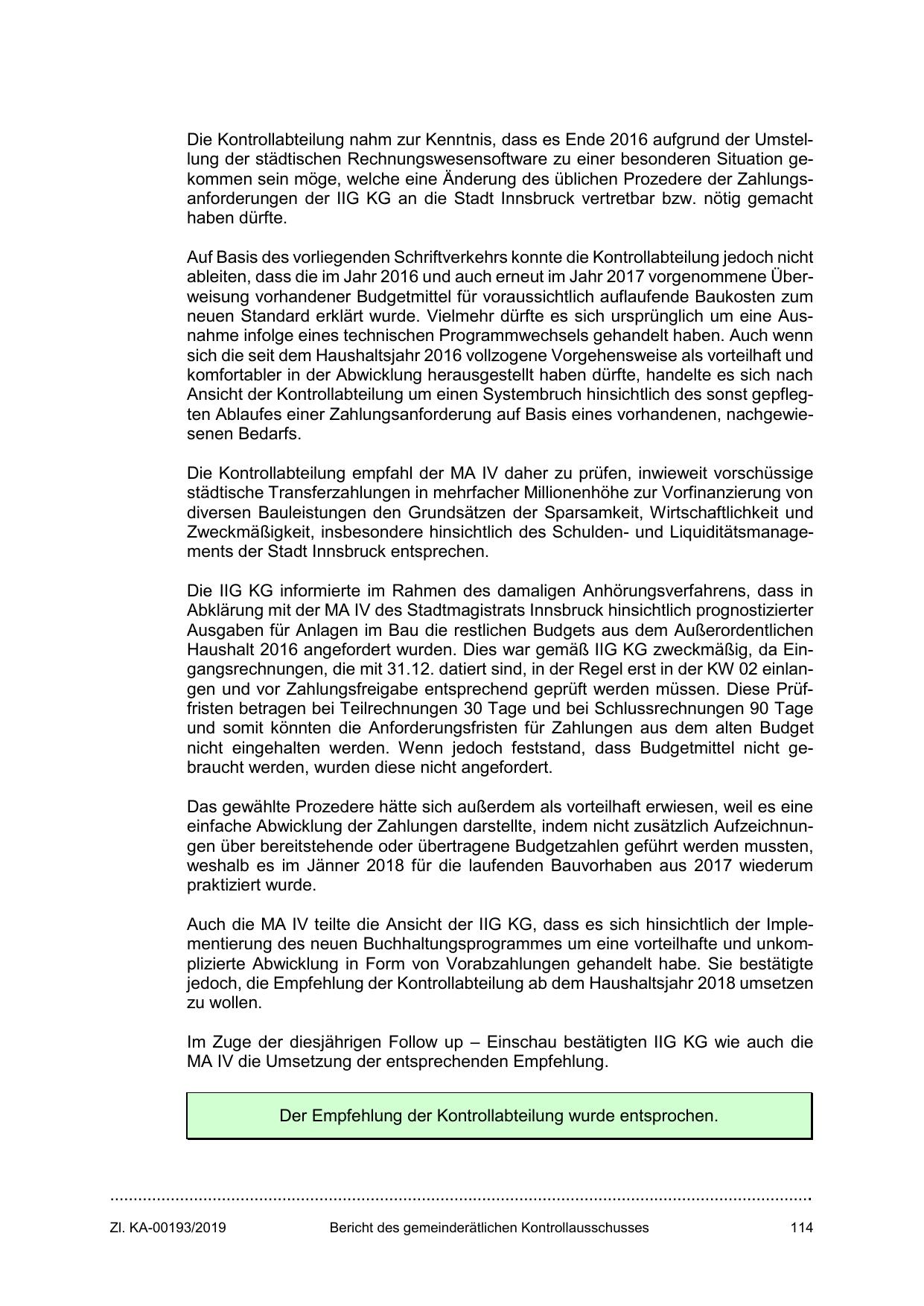 Die Kontrollabteilung nahm zur Kenntnis, dass es Ende 2016 aufgrund der Umstellung der städtischen Rechnungswesensoftware zu einer besonderen Situation gekommen sein möge, welche eine Änderung des üblichen Prozedere der Zahlungsanforderungen der IIG KG an die Stadt Innsbruck vertretbar bzw. nötig gemacht