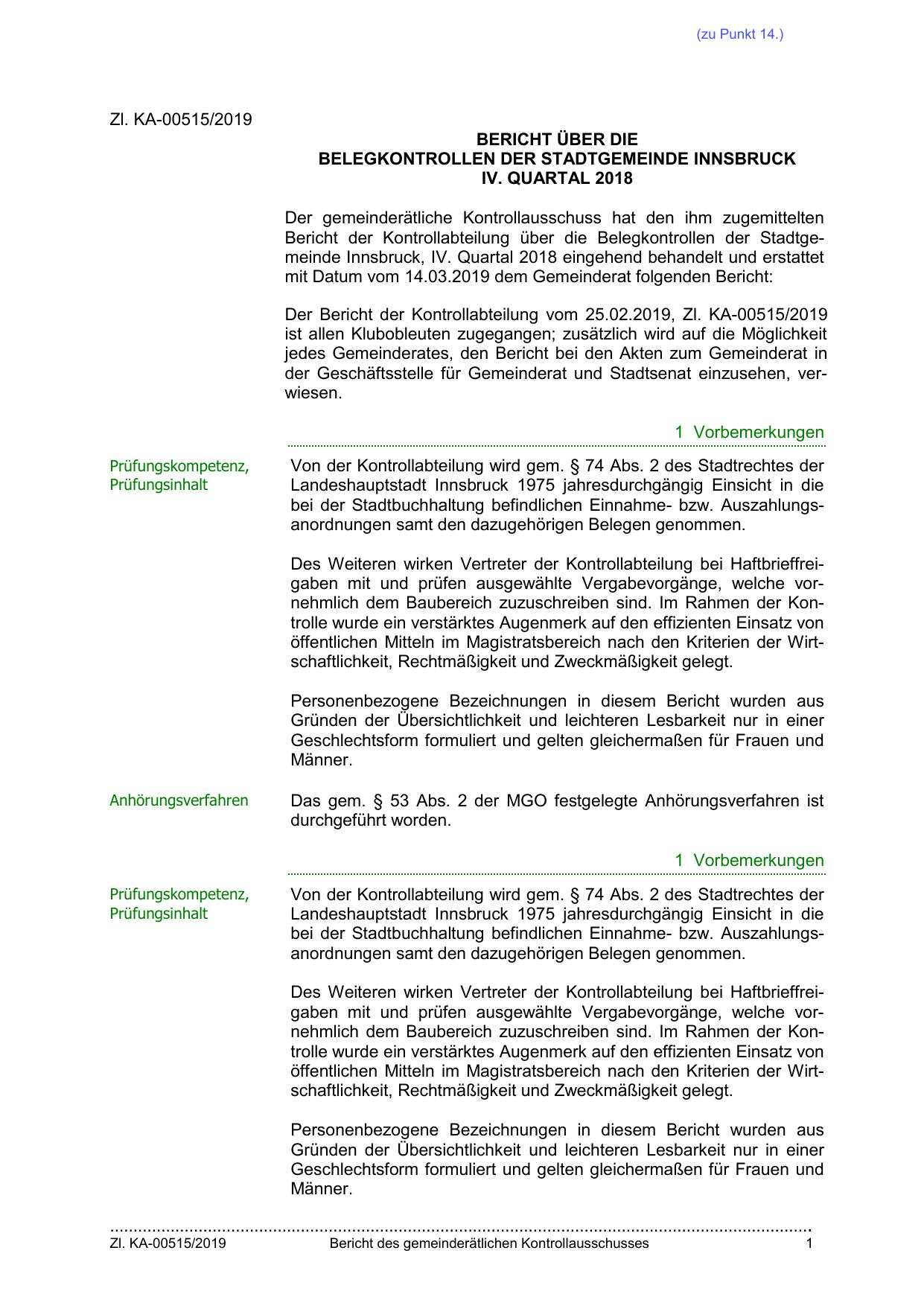 Der Bericht der Kontrollabteilung vom 25.02.2019, Zl. KA-00515/2019