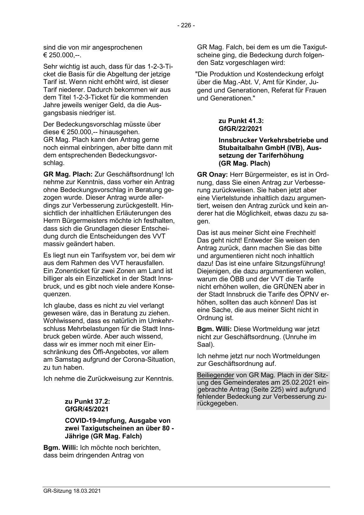 Beiliegender von GR Mag. Plach in der Sitzung des Gemeinderates am 25.02.2021 eingebrachte Antrag (Seite 225) wird aufgrund