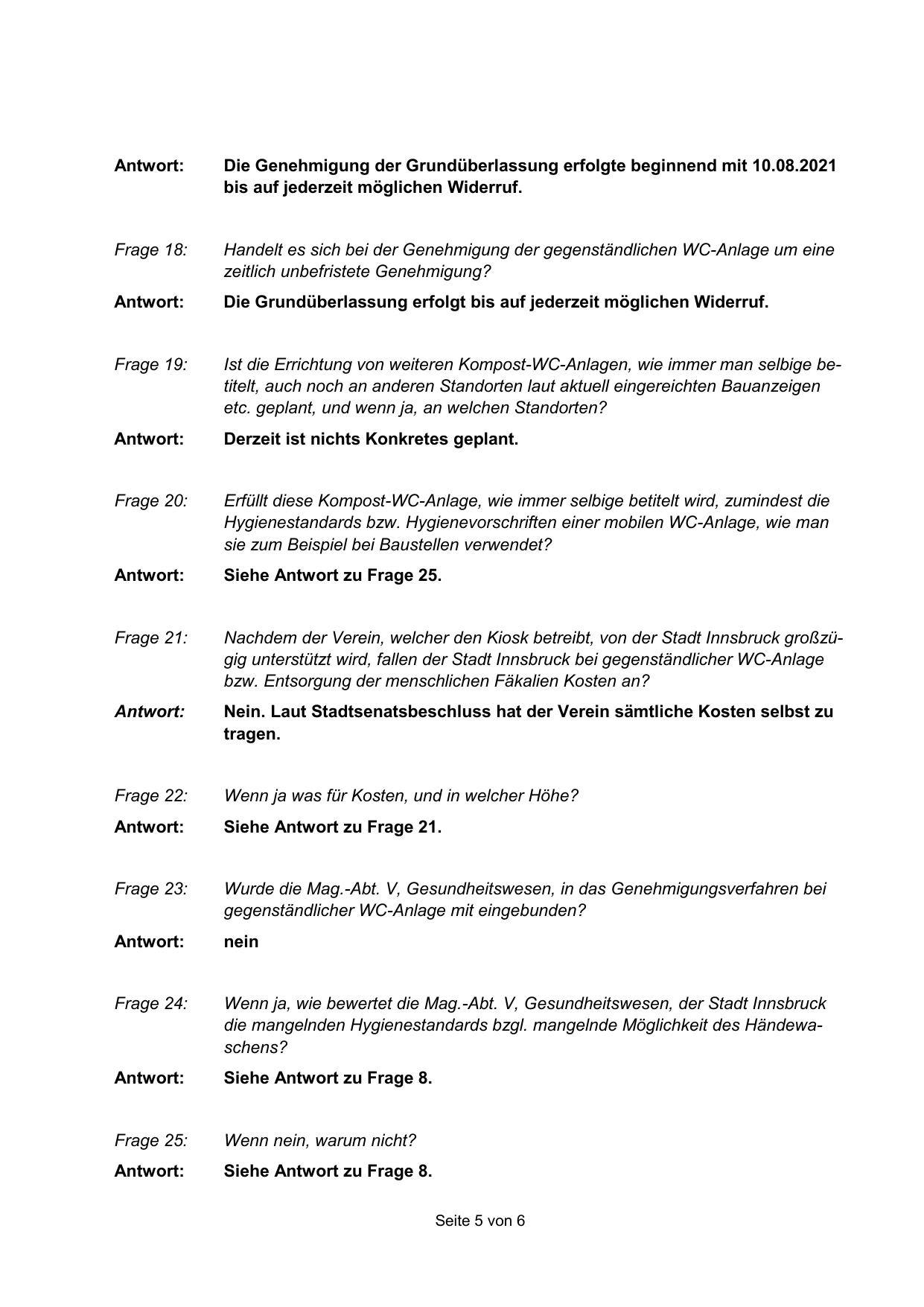 Nachdem der Verein, welcher den Kiosk betreibt, von der Stadt Innsbruck großzügig unterstützt wird, fallen der Stadt Innsbruck bei gegenständlicher WC-Anlage