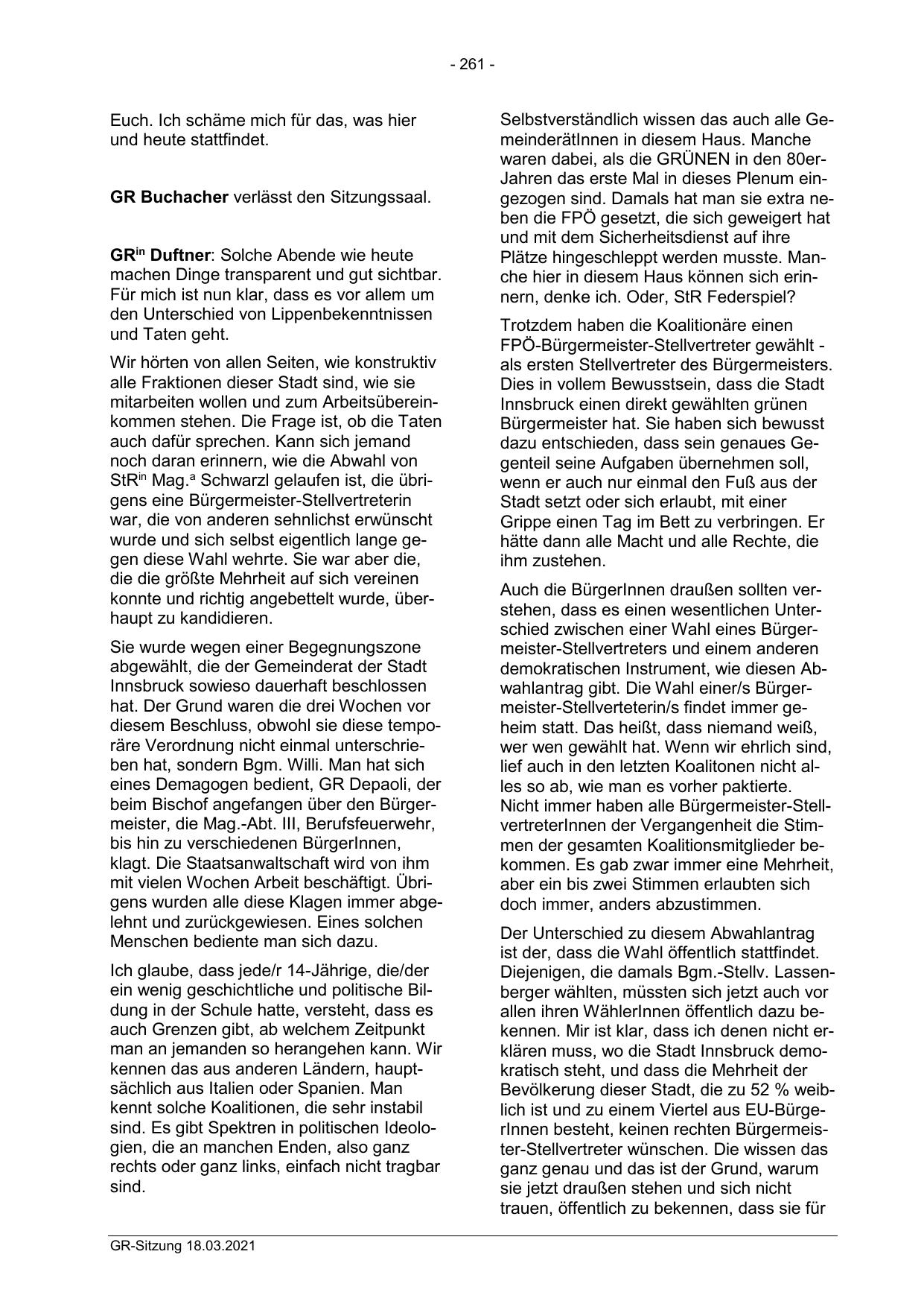 allen ihren WählerInnen öffentlich dazu bekennen. Mir ist klar, dass ich denen nicht erklären muss, wo die Stadt Innsbruck demokratisch steht, und dass die Mehrheit der