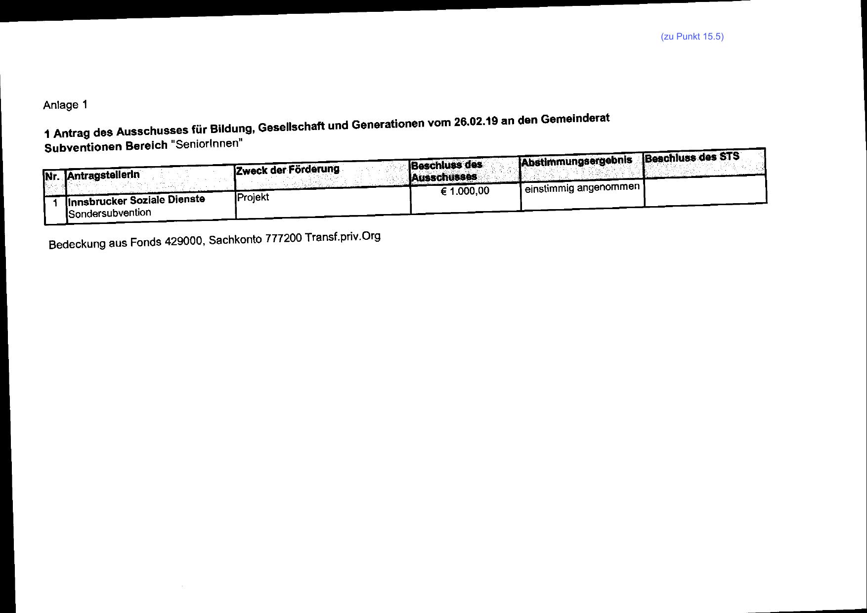 Bedeckung aus Fonds 429000, Sachko