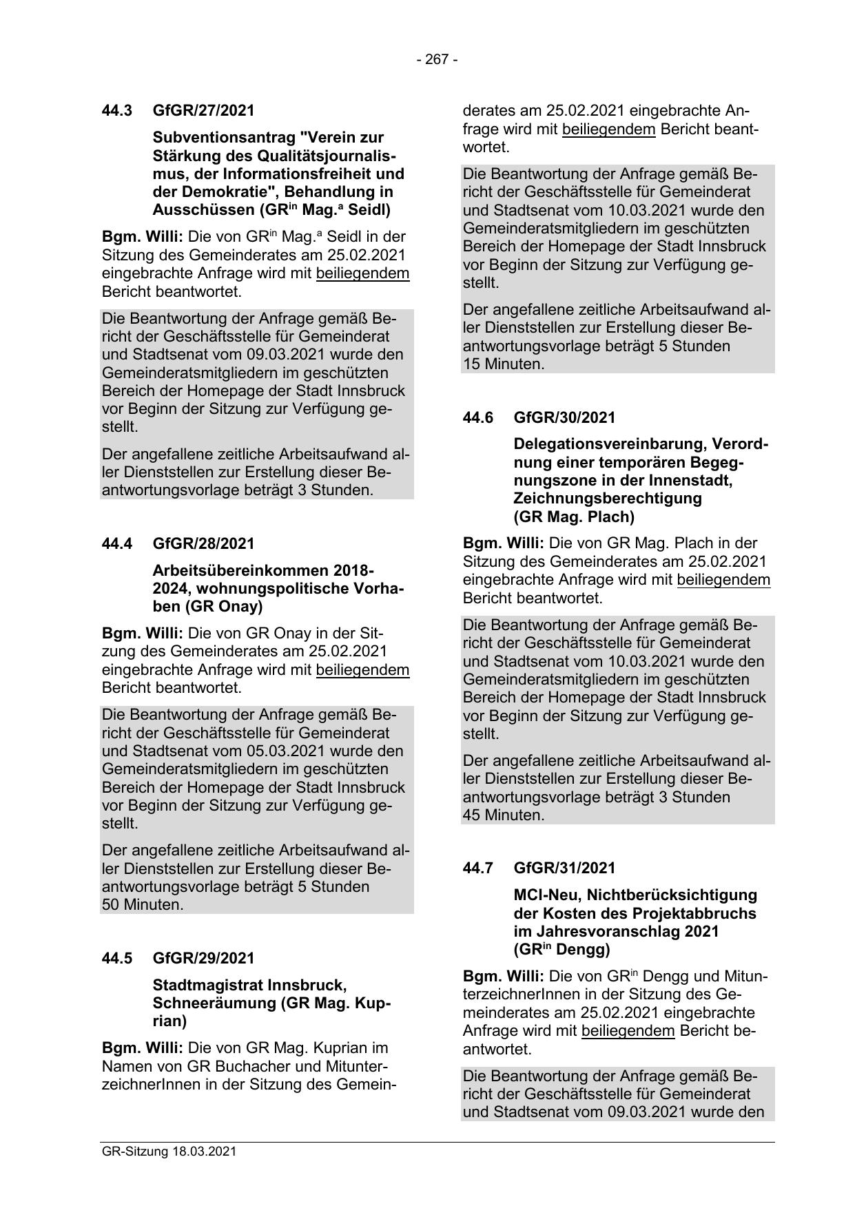 Bgm. Willi: Die von GRin Dengg und MitunterzeichnerInnen in der Sitzung des Gemeinderates am 25.02.2021 eingebrachte