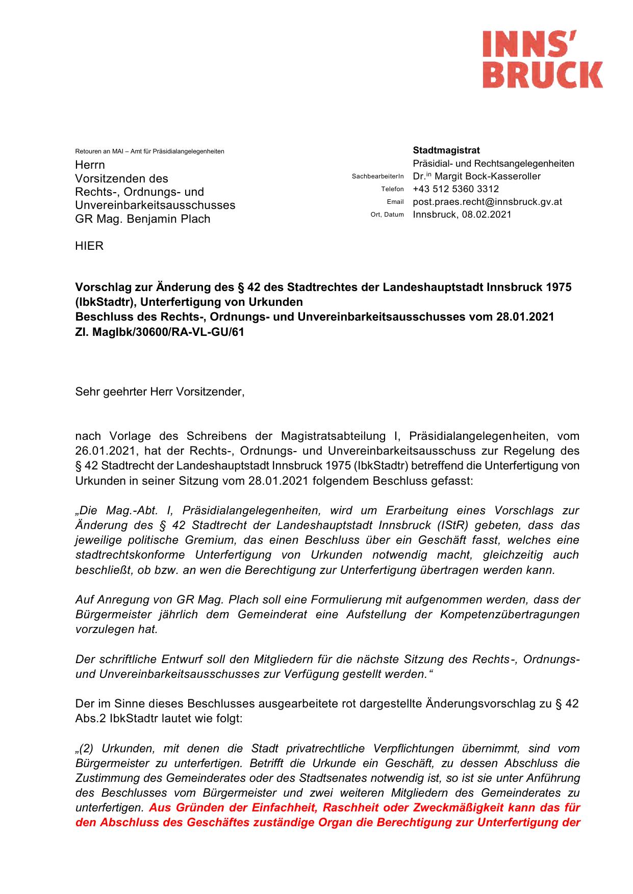 Änderung des § 42 Stadtrecht der Landeshauptstadt Innsbruck (IStR) gebeten, dass das