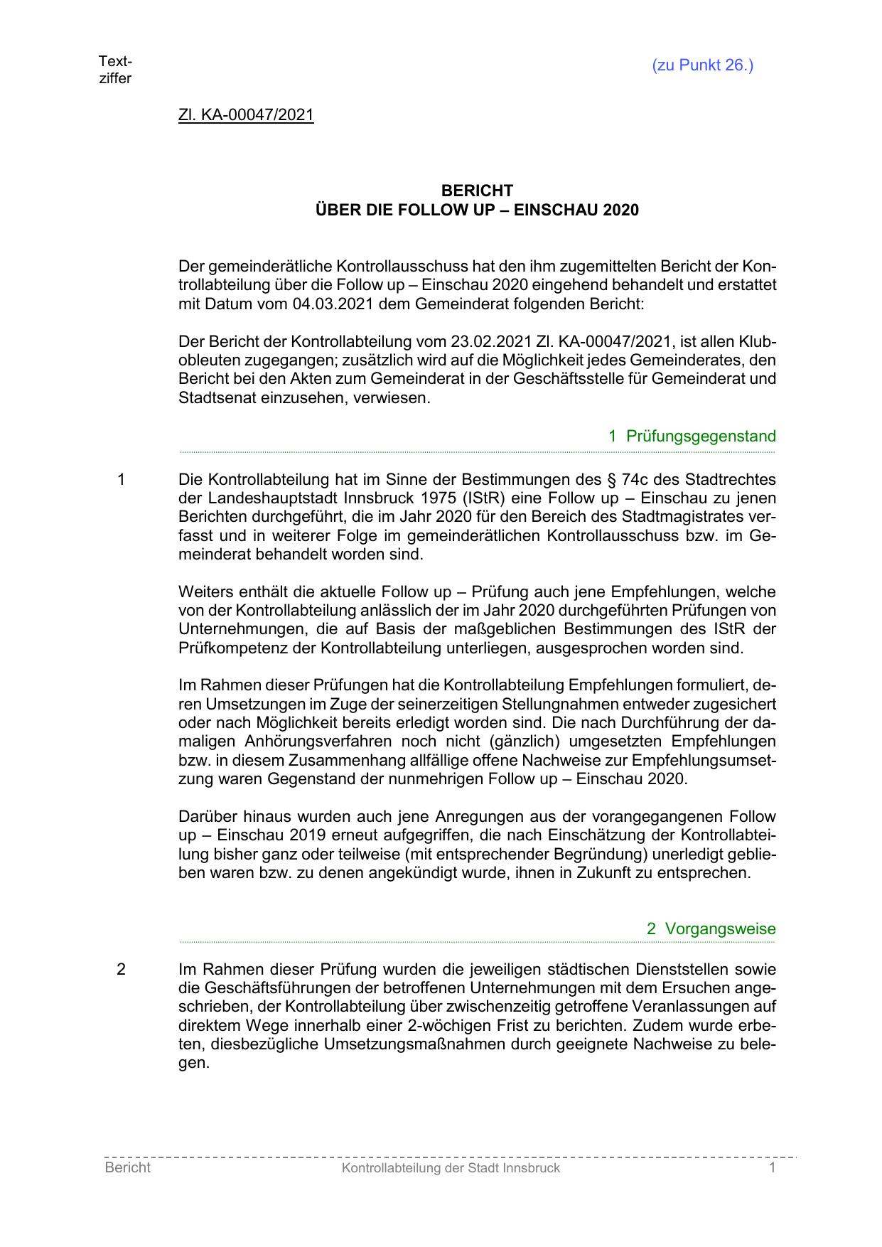 Der gemeinderätliche Kontrollausschuss hat den ihm zugemittelten Bericht der Kontrollabteilung über die Follow up – Einschau 2020 eingehend behandelt und erstattet