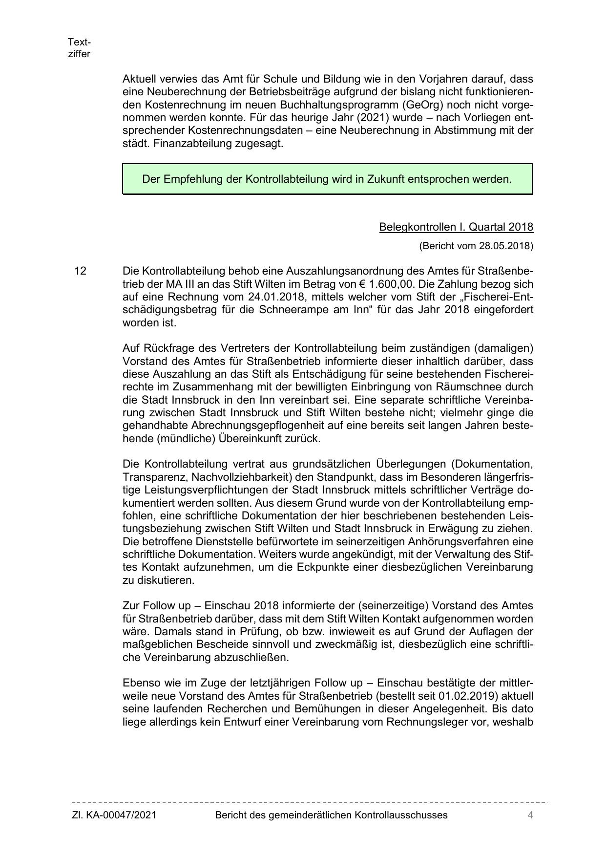 Transparenz, Nachvollziehbarkeit) den Standpunkt, dass im Besonderen längerfristige Leistungsverpflichtungen der Stadt Innsbruck mittels schriftlicher Verträge dokumentiert werden sollten. Aus diesem Grund wurde von der Kontrollabteilung empfohlen, eine schriftliche Dokumentation der hier beschriebenen bestehenden Leistungsbeziehung zwischen Stift Wilten und Stadt Innsbruck in Erwägung zu ziehen.