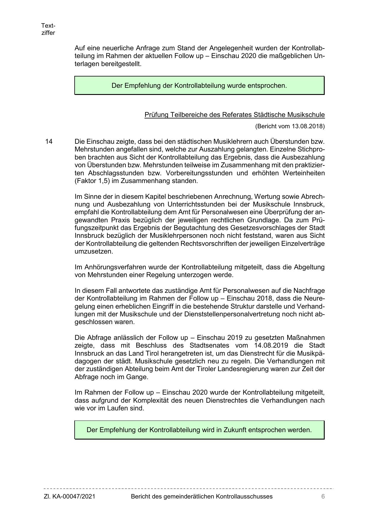 der Kontrollabteilung im Rahmen der Follow up – Einschau 2018, dass die Neuregelung einen erheblichen Eingriff in die bestehende Struktur darstelle und Verhandlungen mit der Musikschule und der Dienststellenpersonalvertretung noch nicht abgeschlossen waren.