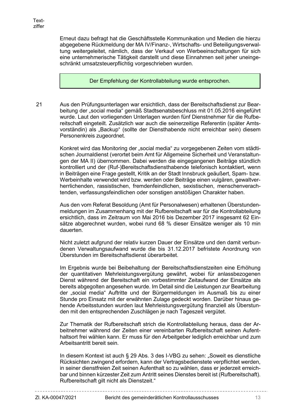 Aus den Prüfungsunterlagen war ersichtlich, dass der Bereitschaftsdienst zur Bearbeitung der „social media“ gemäß Stadtsenatsbeschluss mit 01.05.2016 eingeführt