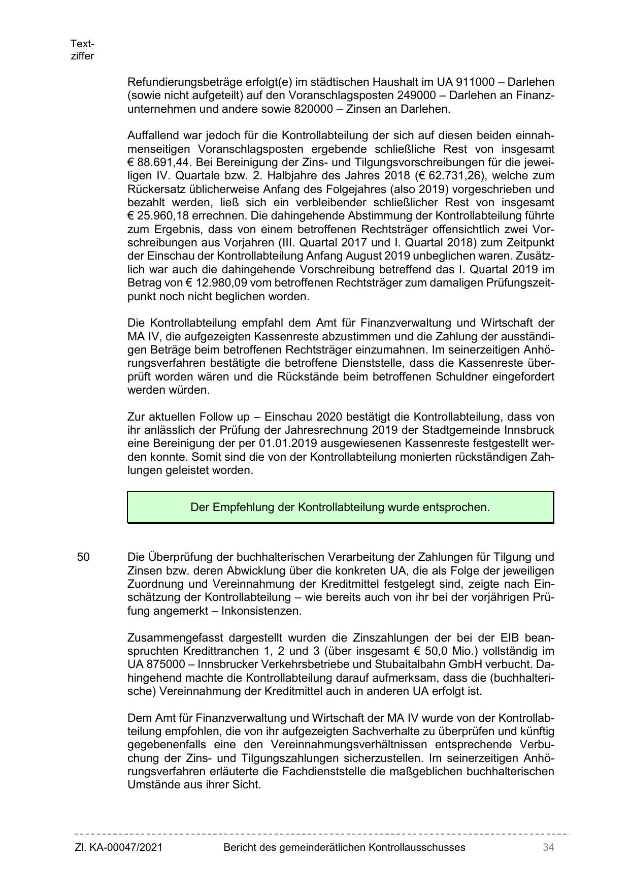 UA 875000 – Innsbrucker Verkehrsbetriebe und Stubaitalbahn GmbH verbucht. Dahingehend machte die Kontrollabteilung darauf aufmerksam, dass die (buchhalterische) Vereinnahmung der Kreditmittel auch in anderen UA erfolgt ist.