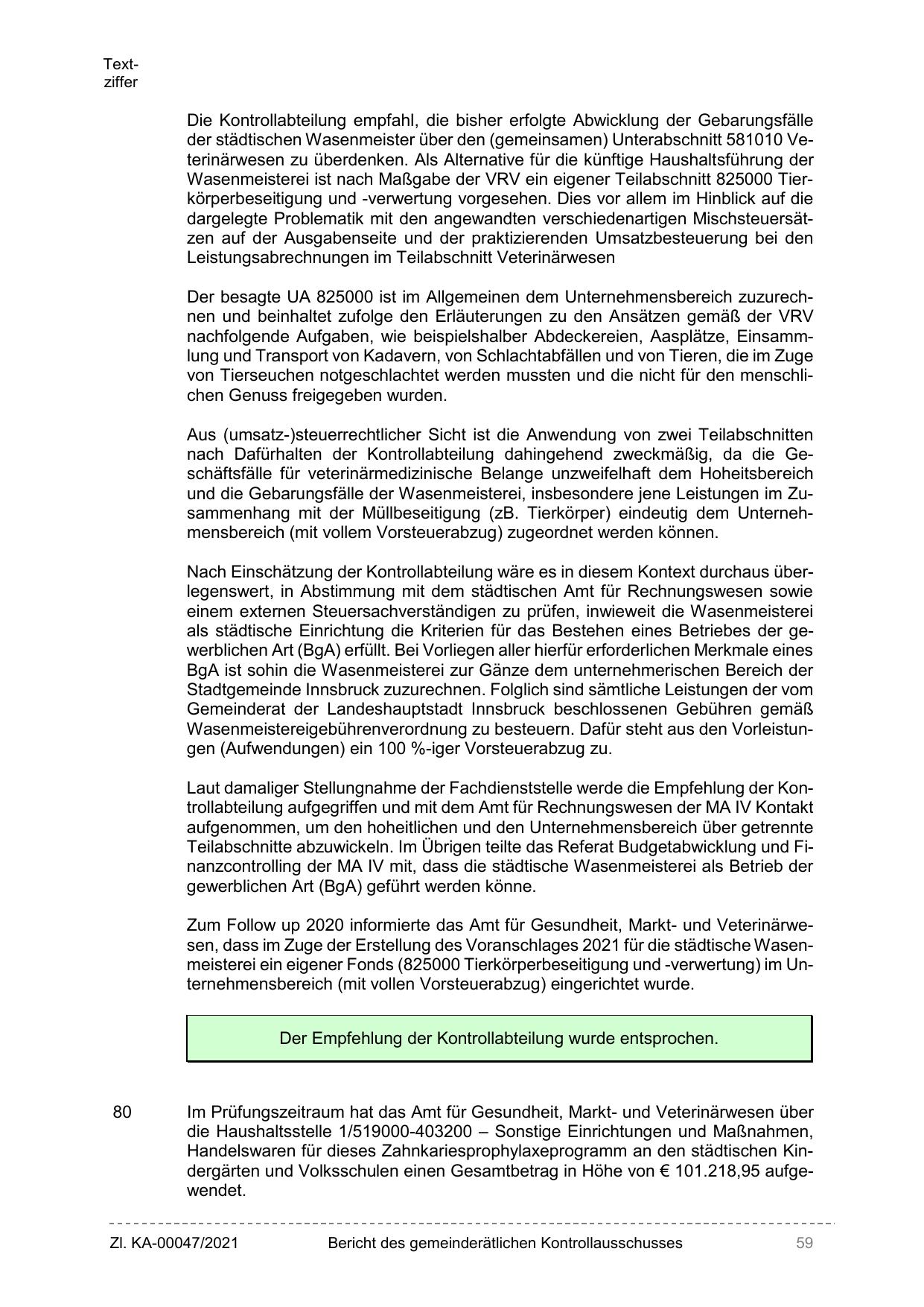 Zum Follow up 2020 informierte das Amt für Gesundheit, Markt- und Veterinärwesen, dass im Zuge der Erstellung des Voranschlages 2021 für die städtische Wasenmeisterei ein eigener Fonds (825000 Tierkörperbeseitigung und -verwertung) im Unternehmensbereich (mit vollen Vorsteuerabzug) eingerichtet wurde.